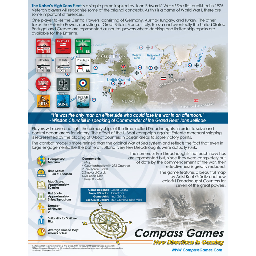 Players will move and fight the primary ships of the time, called Dreadnoughts, in order to seize and control ocean areas for Victory. The effect of the U-Boat campaign against Entente merchant shipping is represented by the placing of U-Boat counters in ocean areas to score victory points. The combat model is more refined than the original War at Sea system and reflects the fact that even in large engagements, like the battle of Jutland, very few Dreadnoughts were actually sunk.