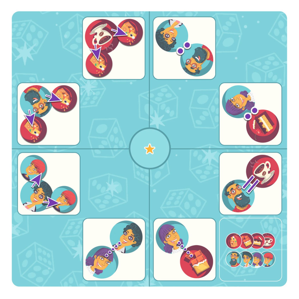 - A challenge in logical thinking and deduction skills, where each player contributes to finding the location of the characters, their meals and their associated items.