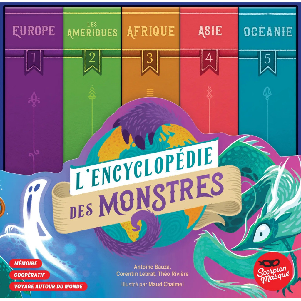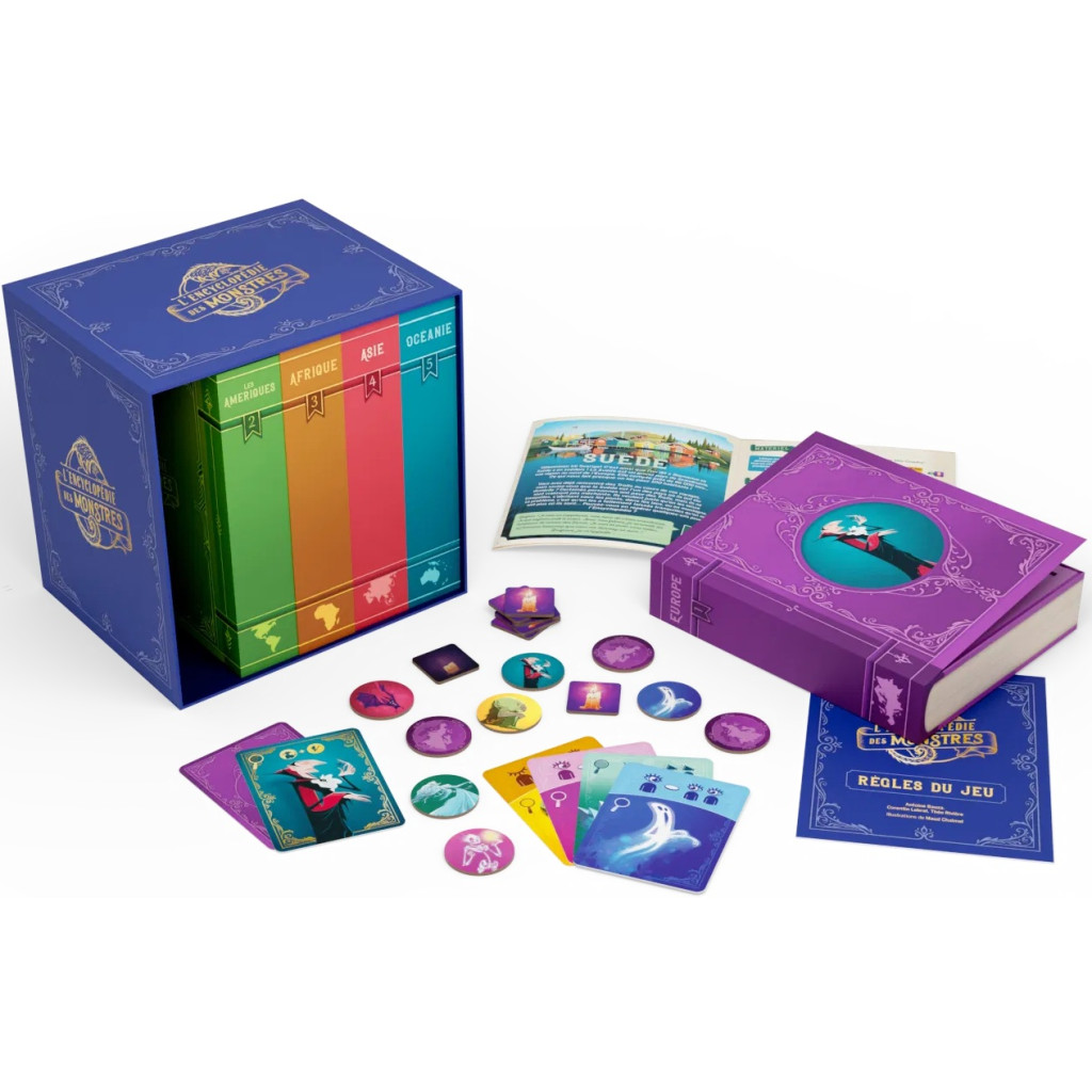 It's a memory game that changes and tells stories. It comes in 5 colorful volumes, like a real encyclopedia, representing the 5 continents. Each volume contains everything you need to visit the 3 countries on that continent. Each country offers new ways to play, with its own rules, challenges, and monsters.
