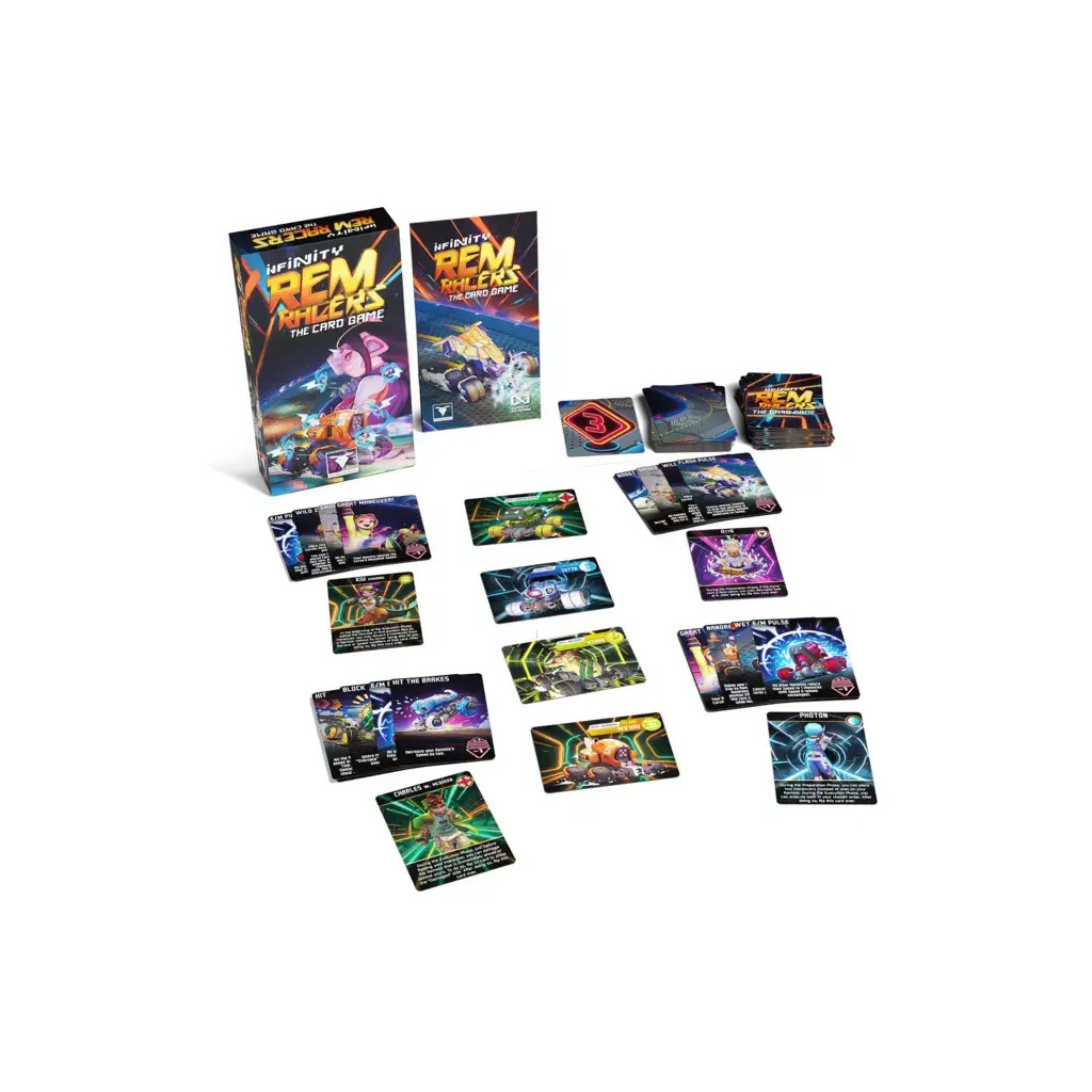 Infinity - REM Racers - The Card Game is an exciting card game that combines strategy and speed. Compete in frantic races, where you use your cards cunningly to advance and slow down your opponents - only the most cunning will win! Perfect for group or family enjoyment at any time, lead the podium in REM Racers!