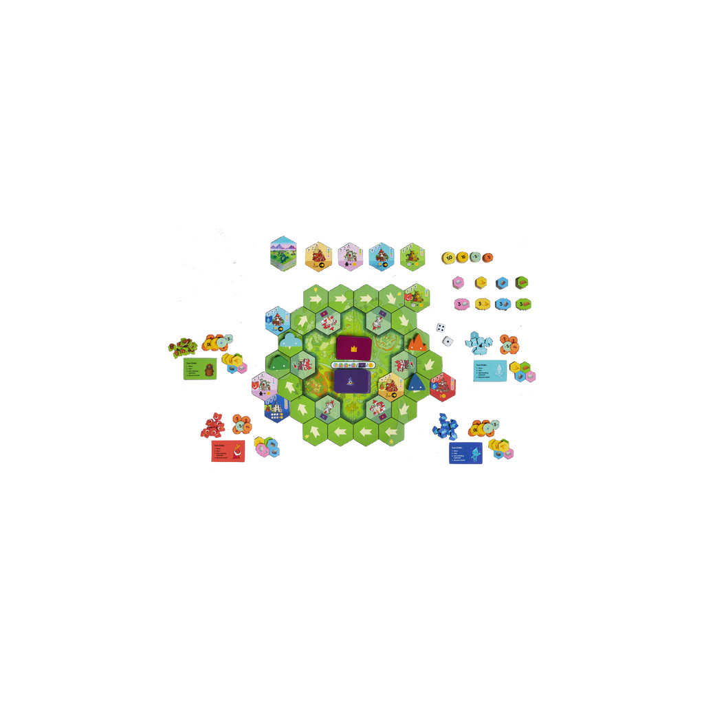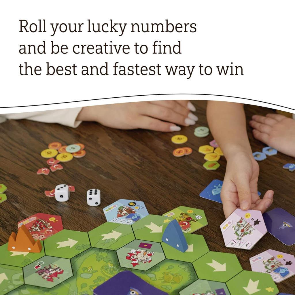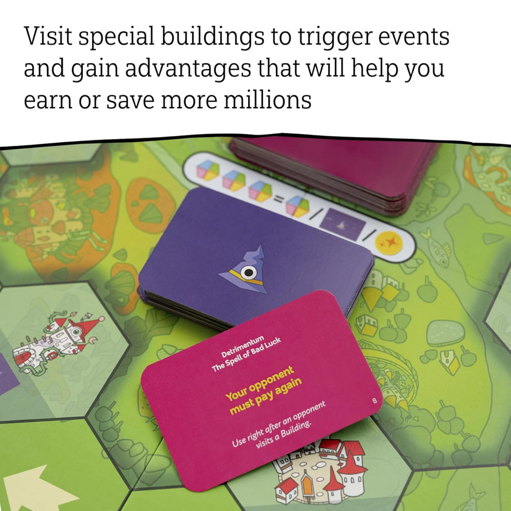 To move around the board, players will roll the dice and move their meeple the corresponding number of track spaces. When the movement is complete, a player must visit all the adjacent buildings around the hex where they stopped. To visit a building means applying the effect written on the building’s tile. When visiting Town Square, players trigger various events; be it a good or a bad event, players cannot refuse to apply it. There is also a Magic Tower that can help players with magic effects throughout the game. After performing the visit action, players may sell a building if they wish to and gain as many millions as stated in the current building’s price. Finally, players must choose between discarding a building from the market and getting the corresponding resources or constructing a building available in the market and spending resources for it.