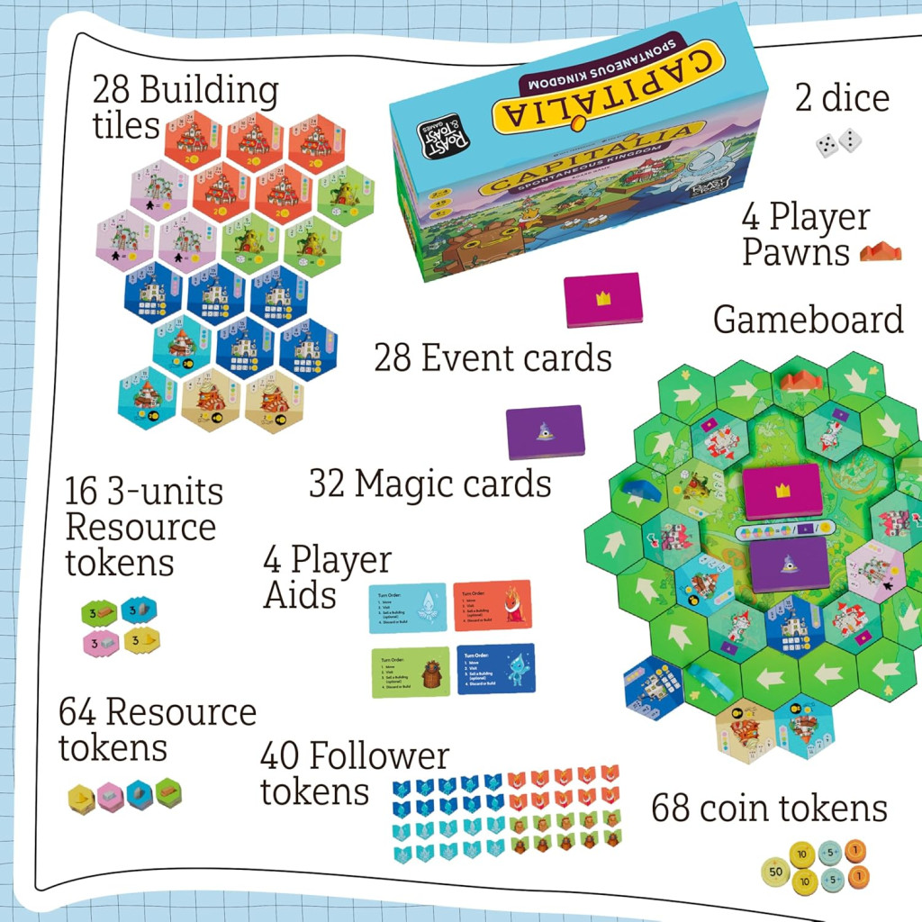 Capitalia: Spontaneous Kingdom is a competitive family board game where each player takes on a role of one of the elements. The goal of the game is to be the first to earn 100 million.