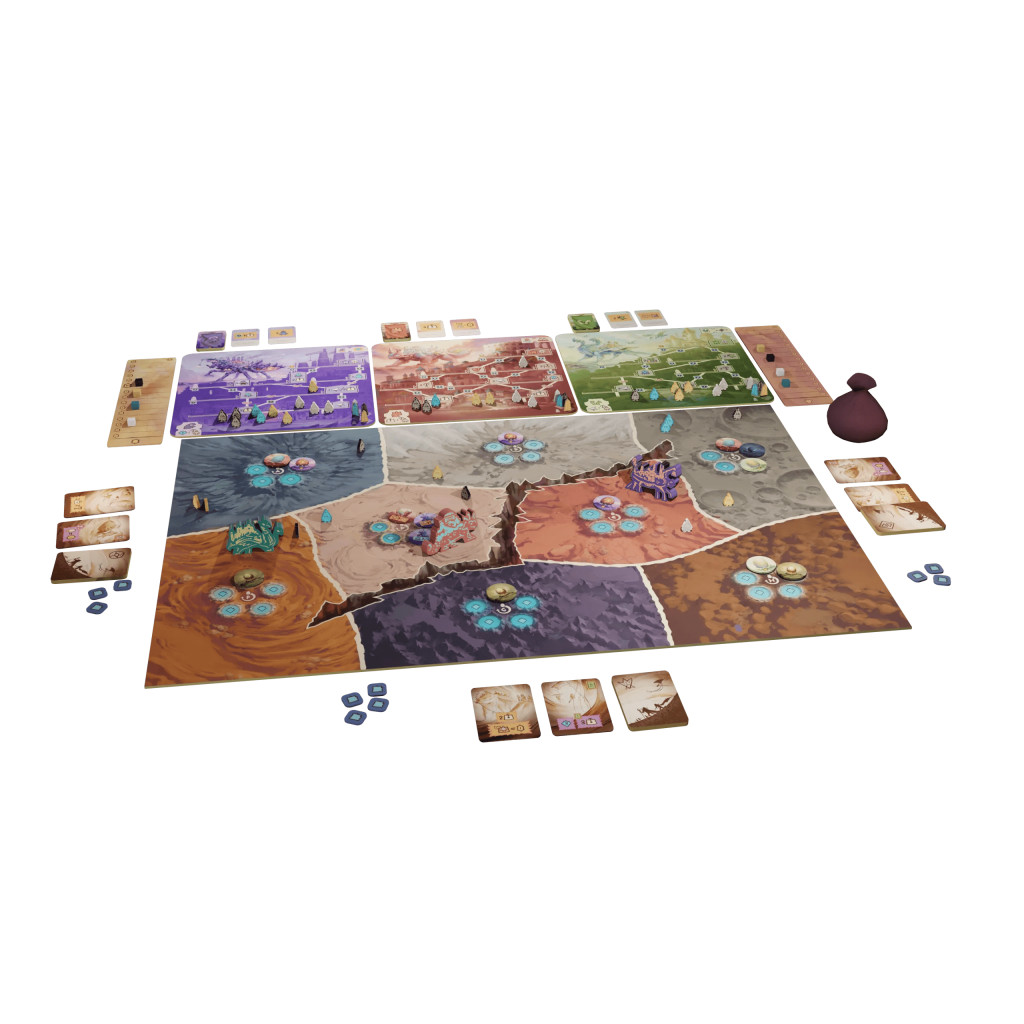 During the game, players hang-glide between the dynamic map and the modular Colossi boards, racing to collect precious eggs, hatch newborns, and outmaneuver their rivals. Your units are your most vital resource as every placement and movement matters. Send your envoys up into the cities to gain benefits and influence for your tribe, or glide them down into the wastes below to compete for eggs that the Colossi lay on their wanderings. As the map fills with eggs, the tension rises. Newborns hatch, and players clash in clever contests of positioning and card play with no destruction and no direct attacks — only smart, tactical maneuvers to claim victory.