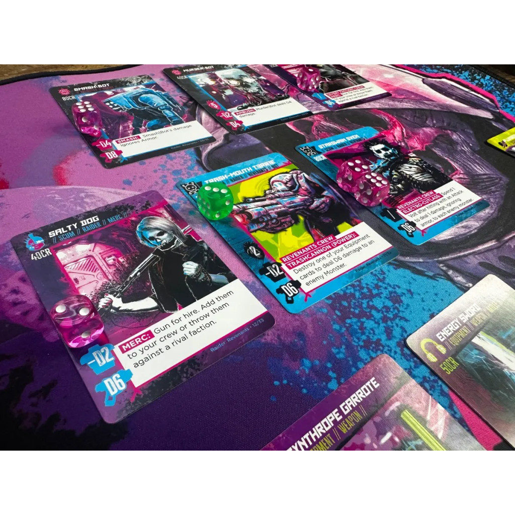 In Plunderlust, each player takes on the role of a scrappy plunderer and their crew of gruesome raiders on their quest for creds and conquest. Each player has a deck of cards to use to build a wreck as they explore it, recruit scum for their LEGION, and torment their opponent.