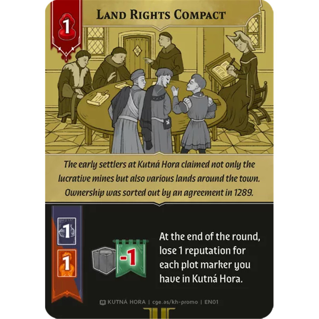 This is an additional event for Package A. This event increases taxes, population, and ore production by 1. At the end of the turn, players will lose 1 reputation point for each plot in Kutná Hora.
