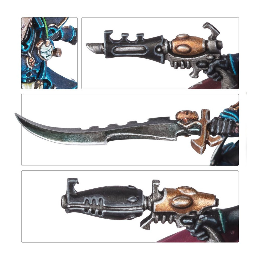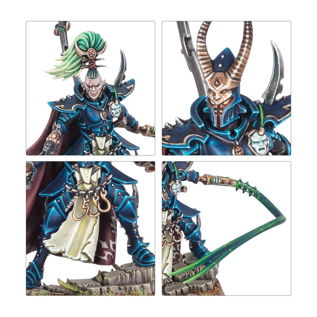 This multipart plastic kit builds one Archon, a cruel and sadistic leader for your Drukhari armies in games of Warhammer 40,000. They specialise in leading realspace raids and claiming captives to be taken back to the dark city of Commorragh. The Archon can be equipped with your choice of soul trap, blast pistol, or splinter pistol, and agoniser, huskblade, or master-crafted power weapon. There are two different options for the chest, three heads, a choice of two belts, and a striking scenic base. No matter how you build them, their dynamic pose and sinister details will look fantastic whether leading your army to victory or being worked on at your painting table.