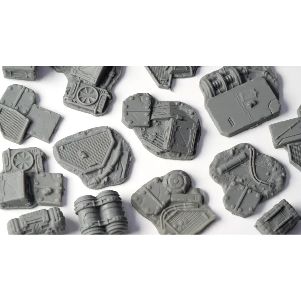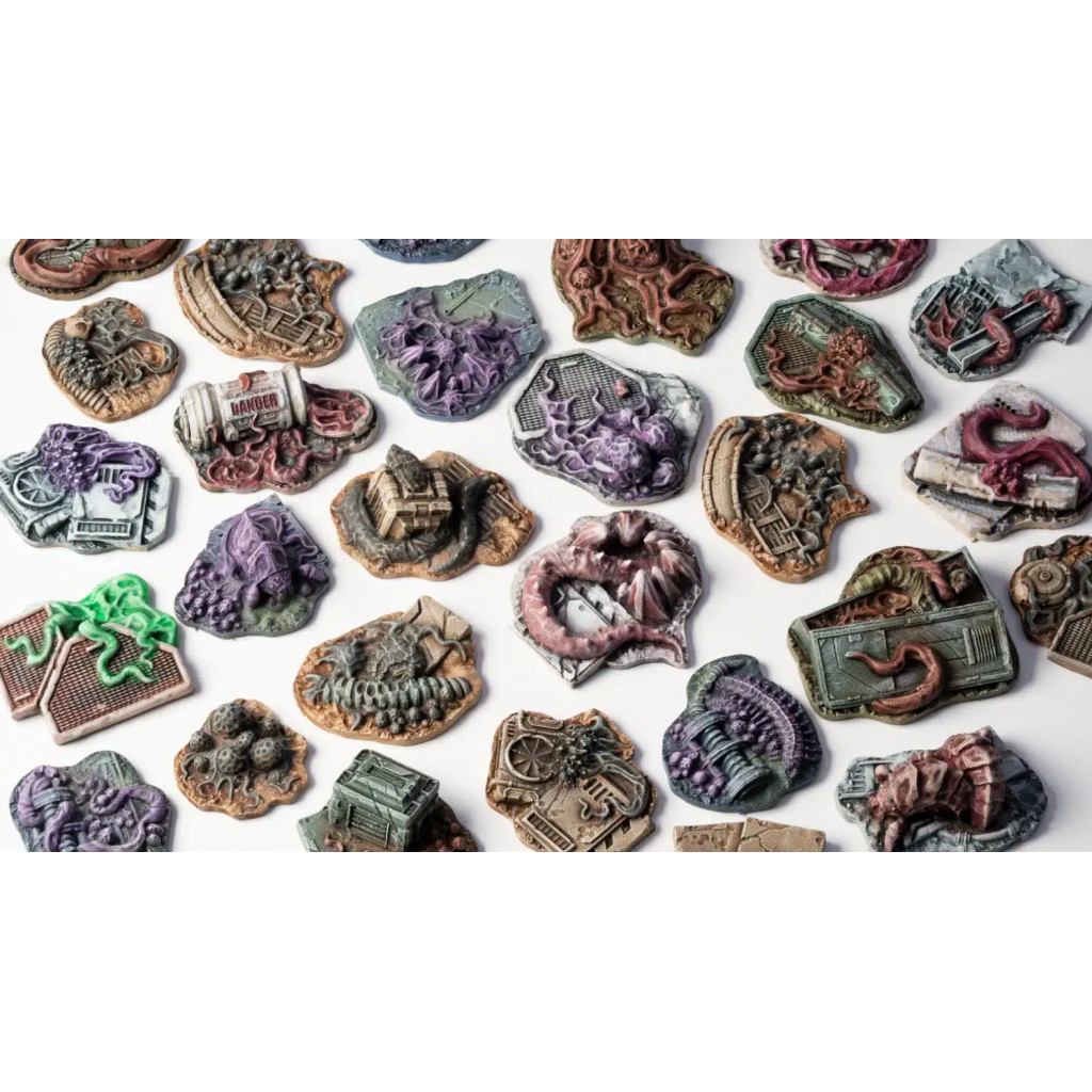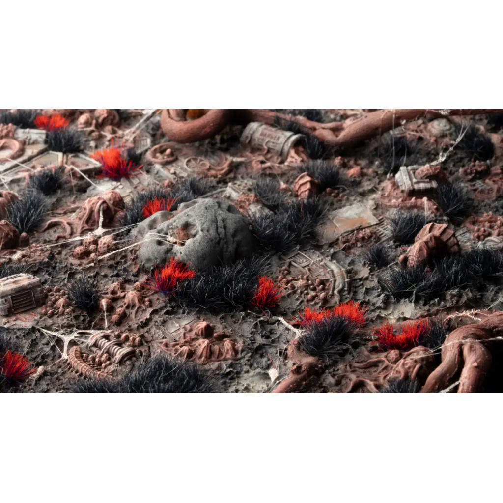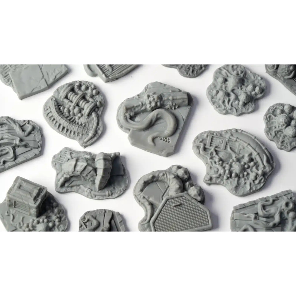 Alien Infestation Basing Bits are fragmented pieces of an infested spaceship wreckage. Perfect to simulate slippery floors covered in oozing alien goo, twisted tendrils and broken wires, alien eggs and small, unpredictable critters. The remains of an old crew serve as a chilling reminder of the horrors that have occurred in this once-human world.