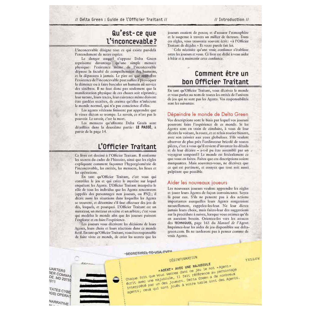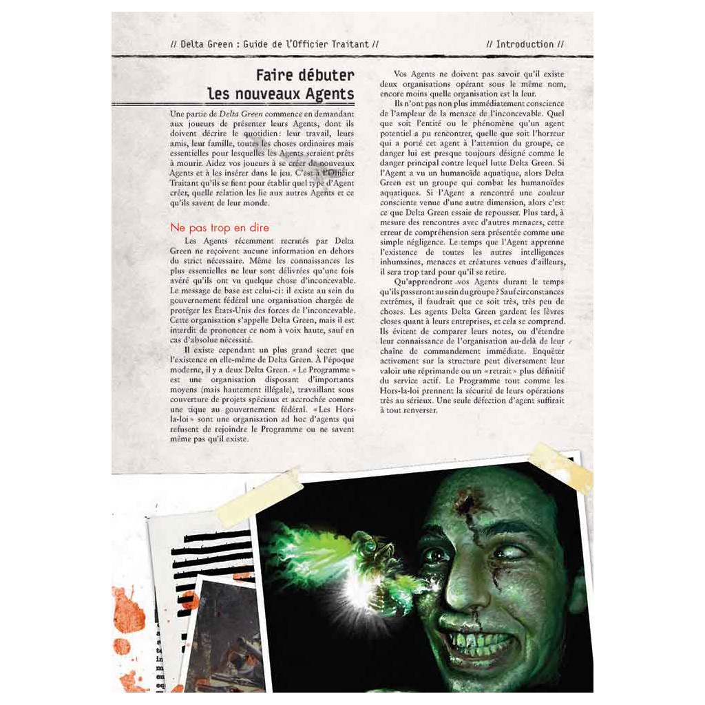 The Handler's Guide presents everything that might be of interest to the game master. It focuses on the history of Delta Green, from its creation to the second half of the 2010s. This large chapter alone contains enough material to build an infinite number of stories, if you feel like taking a trip down memory lane. The last part of the book presents the two current incarnations of Delta Green: the “official” agency and the clandestine one that operates far from the watchful eye of Uncle Sam.