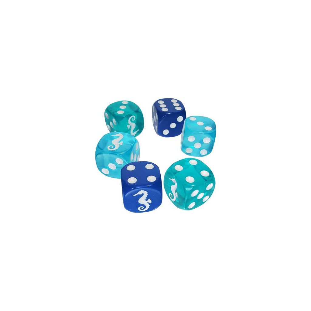 - Six 16mm six-sided dice in cool ocean shades