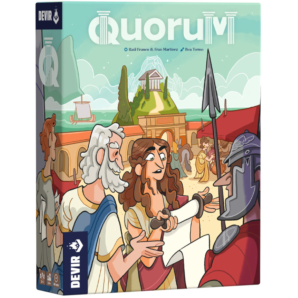Designed by Raul Franco and Fran Martínez and illustrated by Bea Tormo, Quorum allows games for 2 to 4 players, ages 14 and up, lasting about 45 minutes. In Quorum, players step into the sandals of Roman senators who live try to gain the greatest possible influence in Rome and its provinces. The objective is to be the most powerful and influential senator through victory points, which are obtained in the different areas of influence of the game at the end of the twelve rounds of the game.