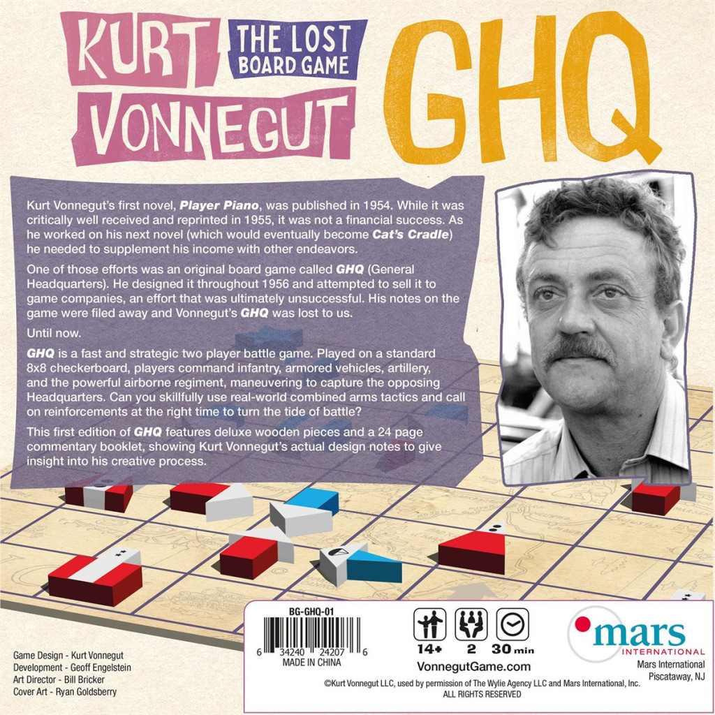 One of those efforts was an original board game called GHQ (General Headquarters). He designed it throughout 1956 and attempted to sell it to game companies, an effort that was ultimately unsuccessful. His notes on the game were filed away and Vonnegut's GHQ was lost to us.