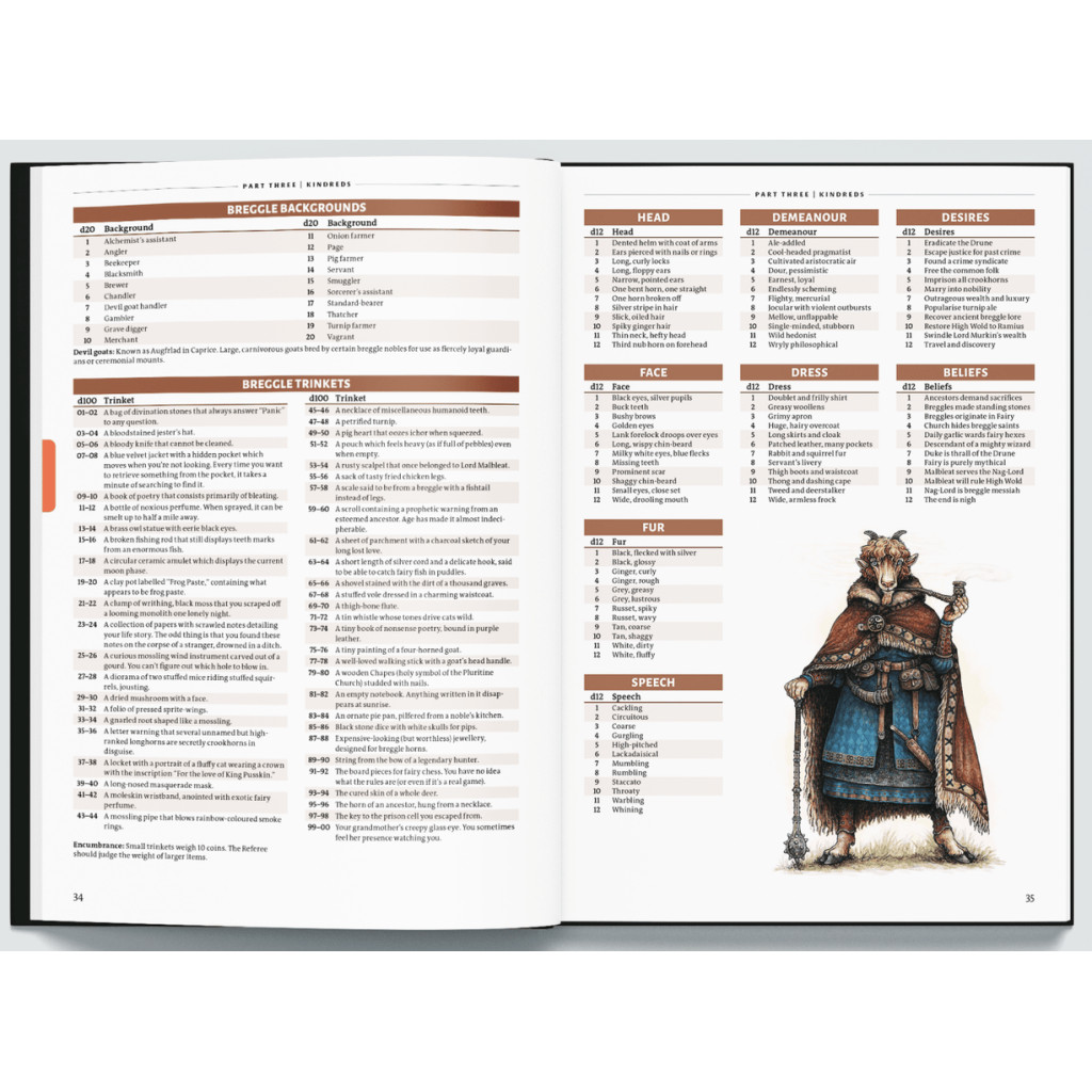 - 6 Kindreds: goat-headed breggles, starry-eyed elves, tricksome grimalkin cat-fairies, everyday humans, fungus-riddled mosslings, and bat-faced woodgrues.