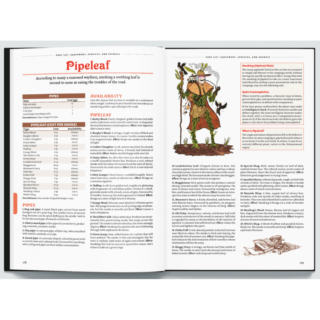 - Flavourful equipment with lists of adventuring gear, arms, mounts, hounds, tavern fare, beverages, pipeleafs, fungi, and herbs.