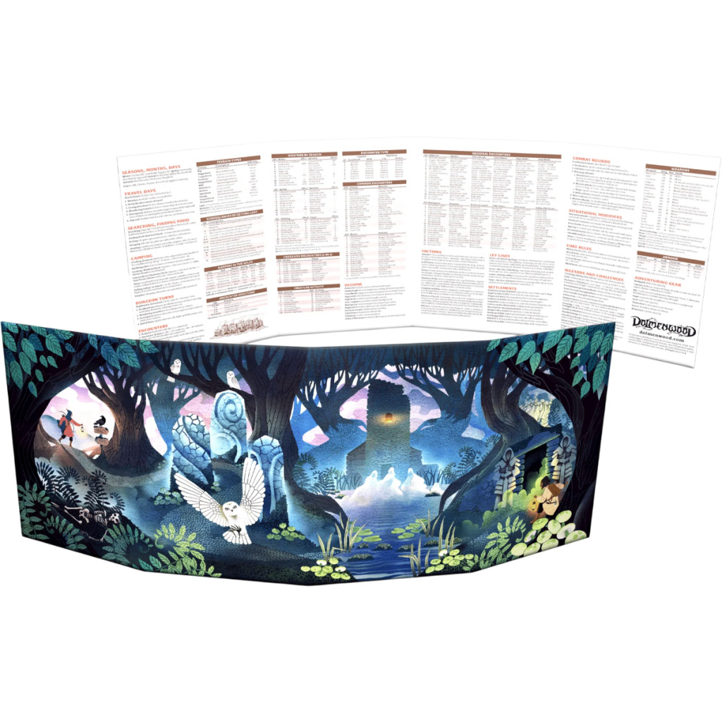 A deluxe screen for Dolmenwood Referees featuring reams of at-a-glance tables and rules, plus beautiful four-panel panorama art by Pauliina Hanninuemi. The screen includes: