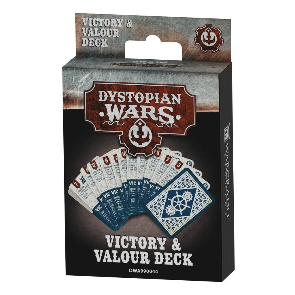 The Victory & Valour Deck is integral to the game of Dystopian Wars. Each card has multiple uses that add to your tactical options. Victory Conditions allow you to maximise your Victory Point tally, guiding your fleet towards scoring Objectives, be it through destroying specific enemy units, or claiming strategic locations in the Play Area. In short, they can be your key to victory. Conversely, if you want to keep your opponent on their toes, you might want to make use of Valour Effects. These are immediate buffs to your models, and bonuses which can be used to add Action Dice, re-roll undesirable results, reposition your units, and so much more. Additionally, the Value on these cards will be utilised for your units’ Crew Checks, determining Initiative, and for other decisive moments in your game.