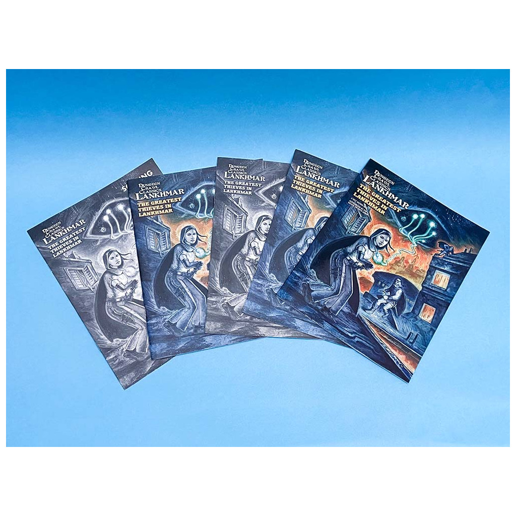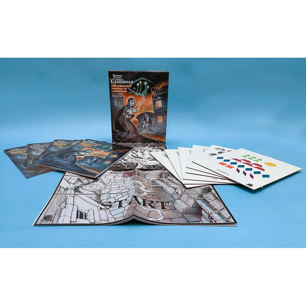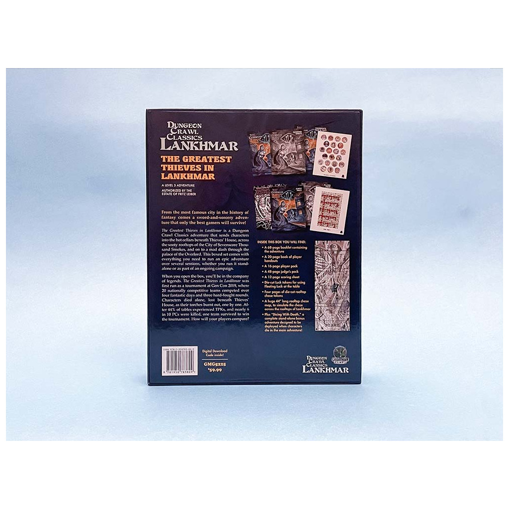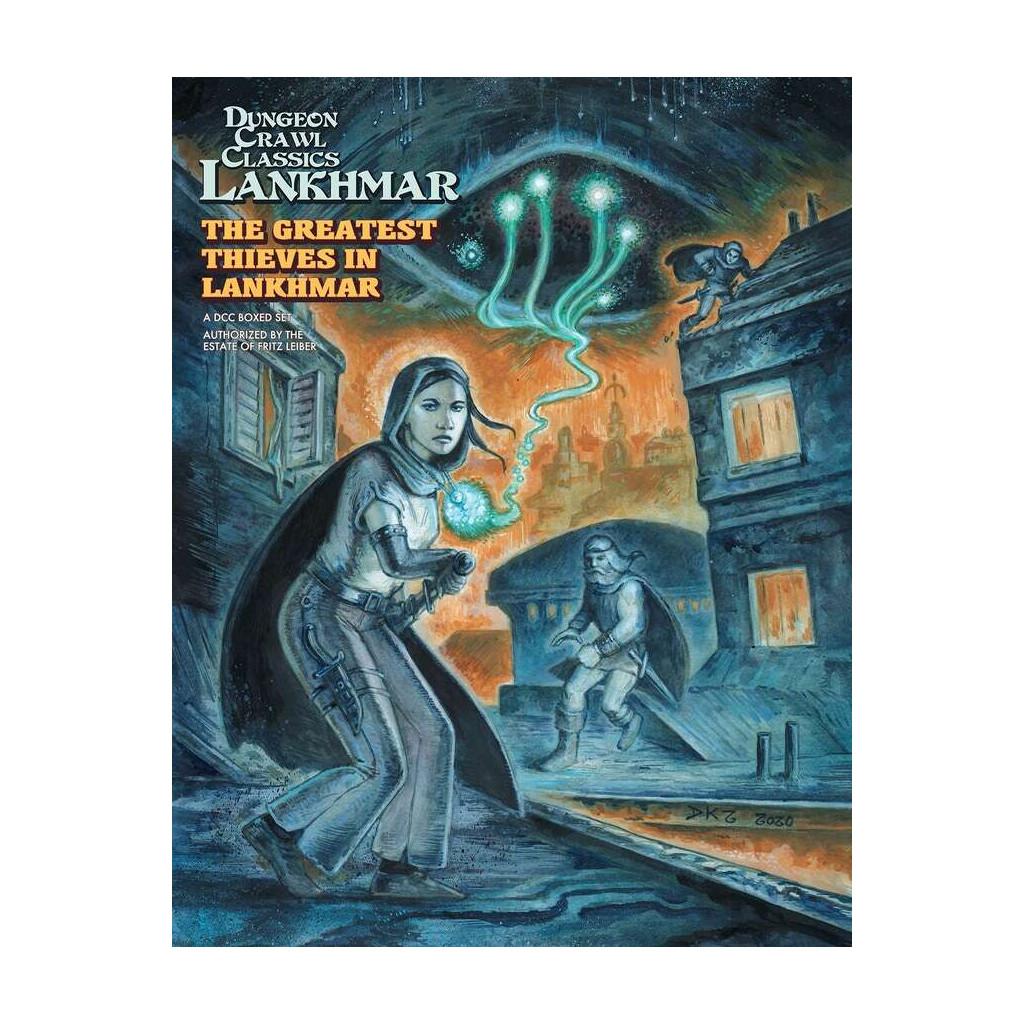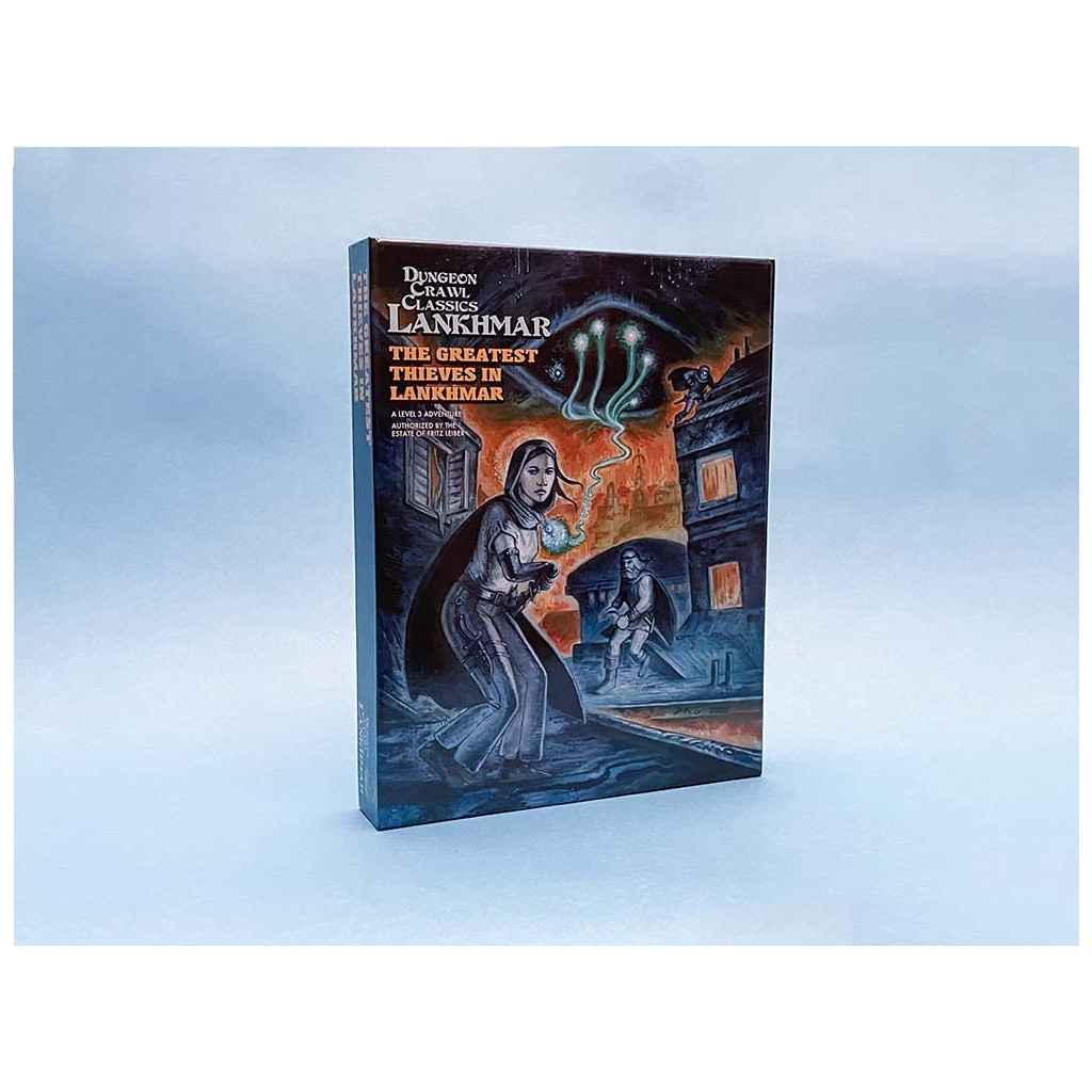 The Greatest Thieves in Lankhmar is a Dungeon Crawl Classics adventure that sends characters into the hot cellars beneath Thieves’ House, across the sooty rooftops of the City of Sevenscore Thousand Smokes, and on to a mad dash through the palace of the Overlord. This boxed set comes with everything you need to run an epic adventure over several sessions, whether you run it stand-alone or as part of an ongoing campaign.