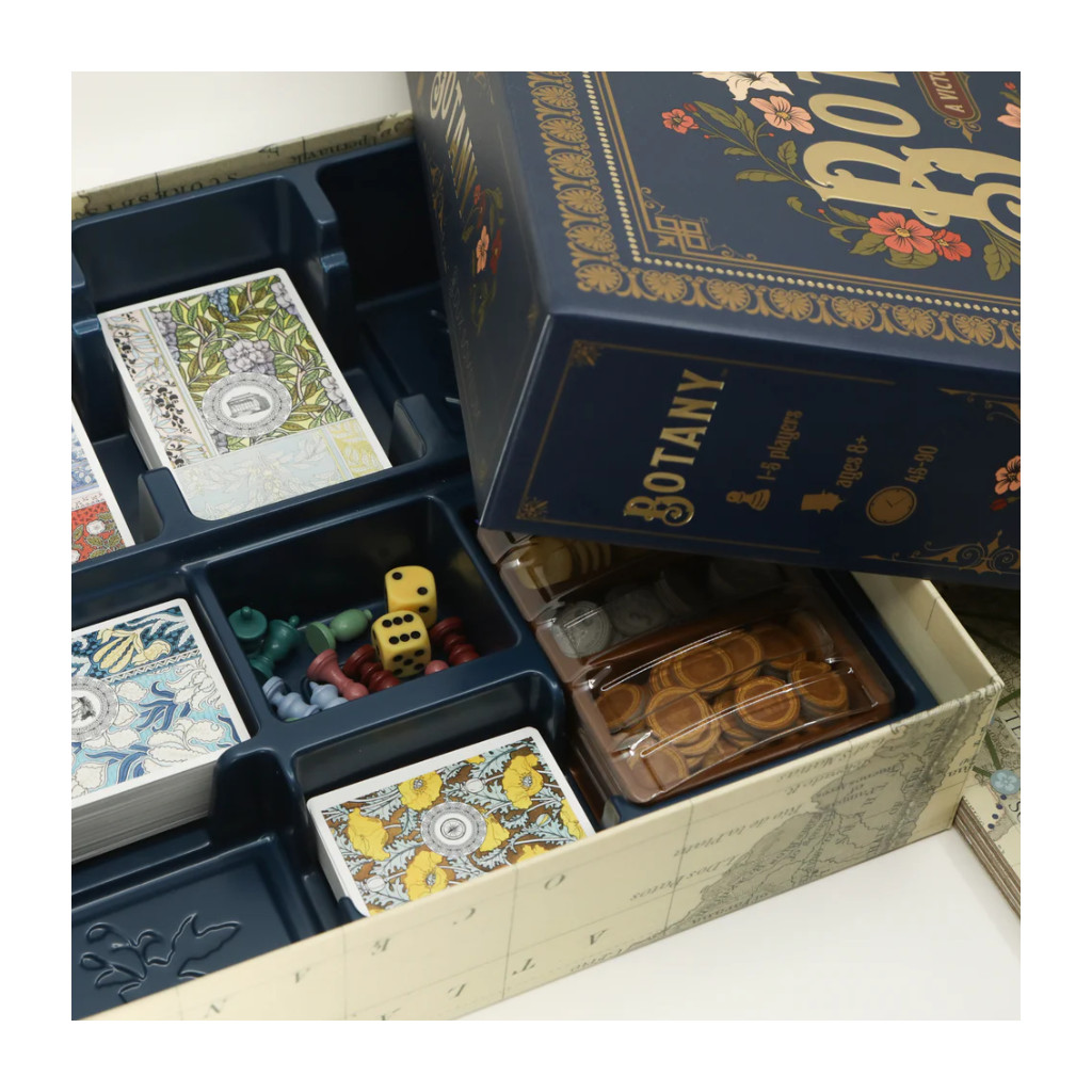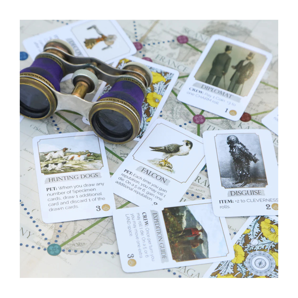 Take on the role of a plant hunter in the Victorian Era as they travel the world in search of fame, fortune, and the coveted Queen’s Prize in Botany. Each turn, players will move around the board to the locations designated on the Specimen cards in their hand.