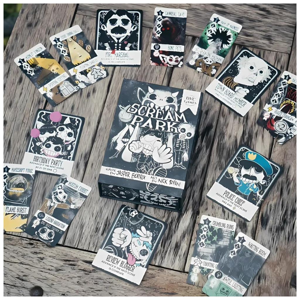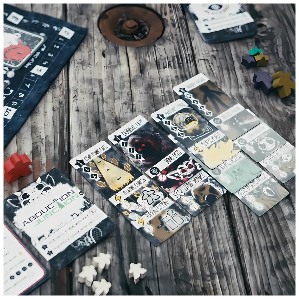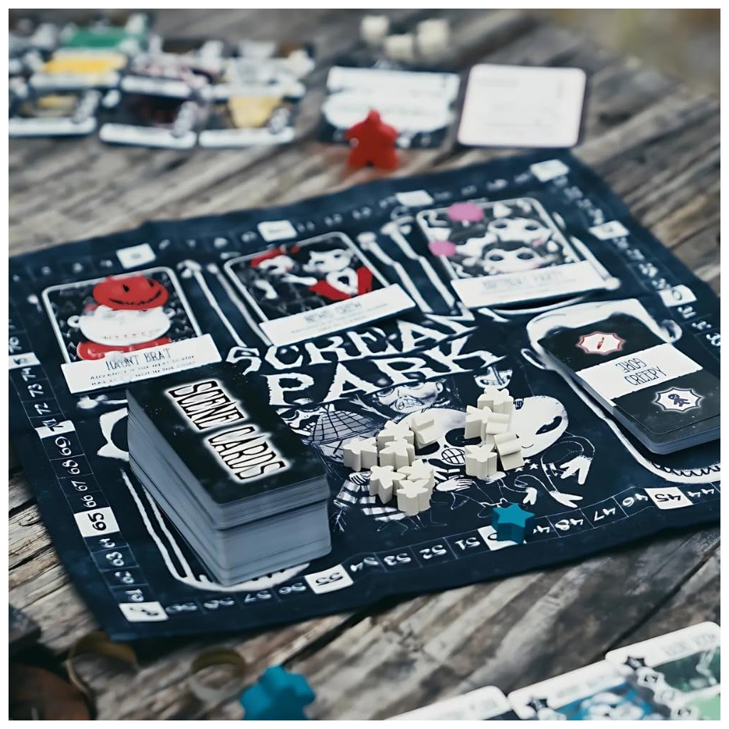 On a turn, draft two cards from a hand to use in your layout, building the experience from left to right. Either add new rooms, or 'scenes', that bolster your theme, or merge them together to bolster previous ones with the use of add-ons like costumes, special effects, and decor. Use your staff to finish your creation, or to rearrange your haunt and perfect the crescendo of fear. Keep in mind your theme, the needs of your scenes, and the VIPs that will visit on the first, second, or third rounds of Opening Weekend, with each randomly seeking different elements to approve of.