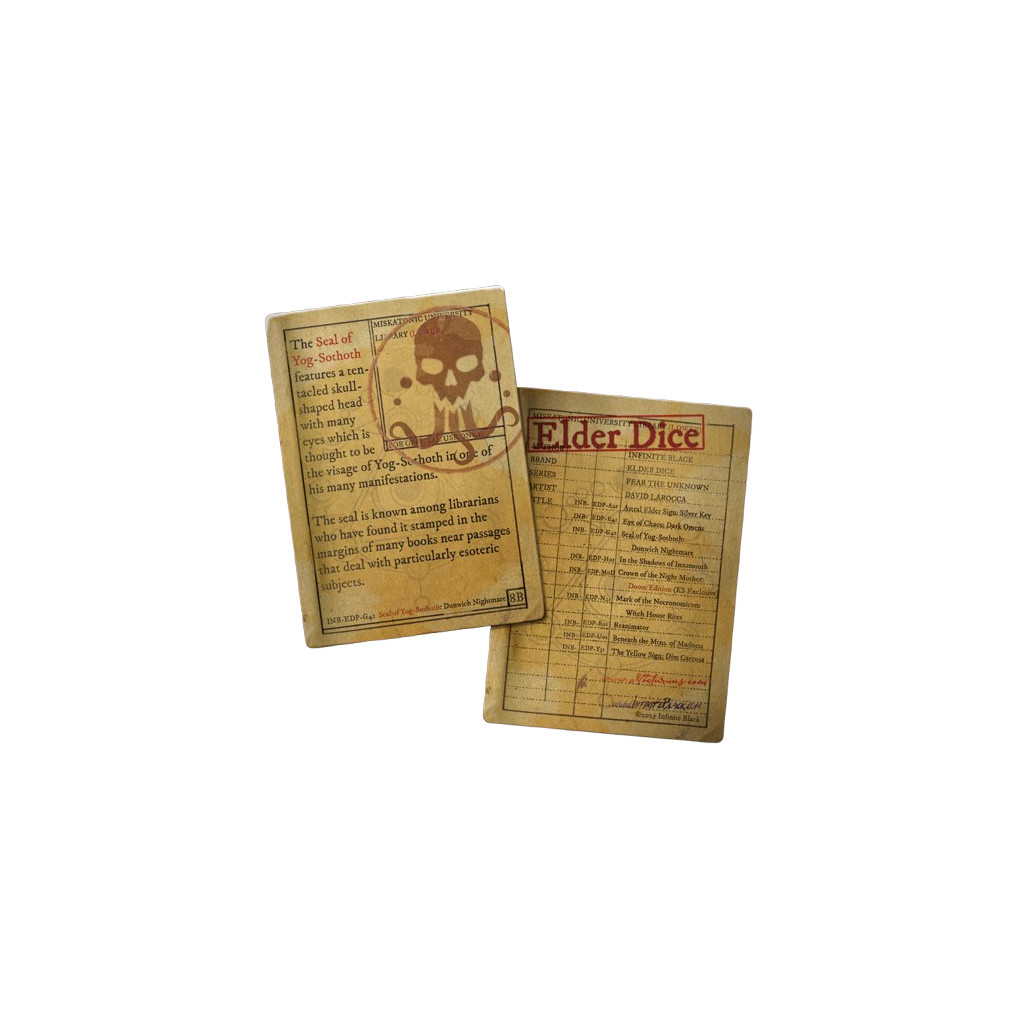 The Seal of Yog-Sothoth is a mark tied to passages that speak of hidden knowledge. Its tentacled skull and many eyes suggest a presence that watches from the threshold of distant realms. The Dunwich Nightmare polyhedral collection reflects this dark legacy with ten dice cast in layered hues of teal, blue and green. Iridescent glitter settles through the resin with the slow drift of stars in deep water. Each die carries the Seal of Yog-Sothoth on its highest face, inked in metallic Ley Silver.