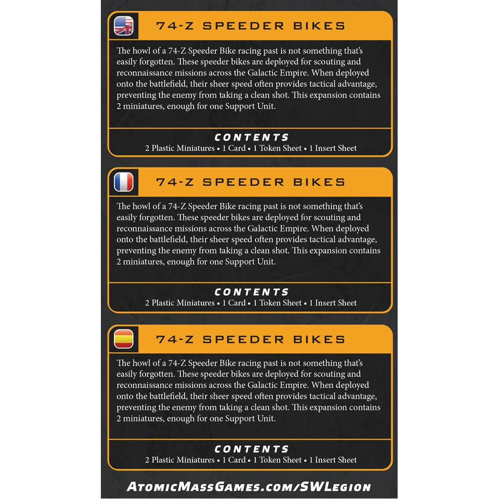 The howl of a 74-Z Speeder Bike racing past is not something that’s easily forgotten. When deployed onto the battlefield, their sheer speed often provides tactical advantage, preventing the enemy from taking a clean shot. This expansion for Star WarsTM: Legion contains 2 74-Z Speeder Bike miniatures, enough for 1 Support unit as well as cards to support gameplay.