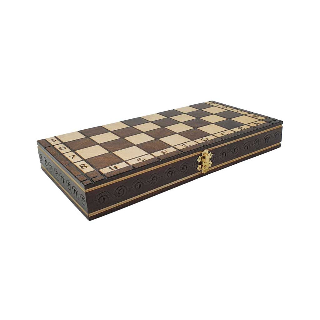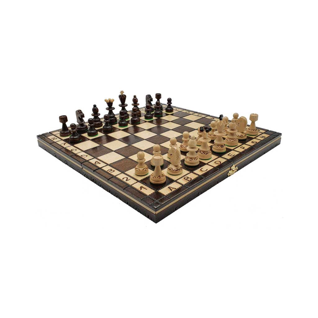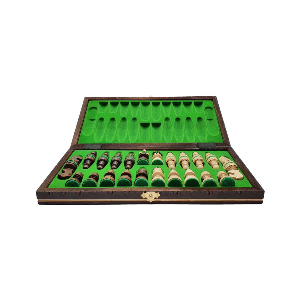 Pearl travel-size chess set (the box folds flat with the pieces stored inside) made of solid wood.
