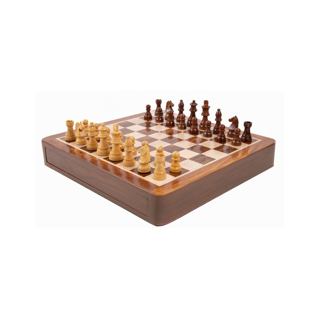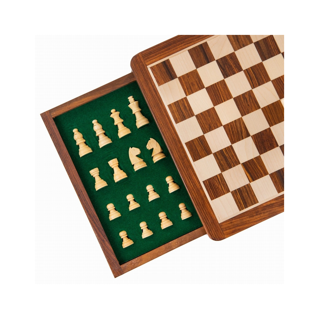 Complete 30 x 30 cm square chess set. The magnetic pieces provide great comfort for playing on a train, in a car or on a boat. The drawer allows for perfect storage of the pieces.