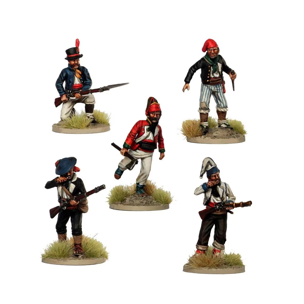 This box contains 40 figures and allows you to build a skirmish force armed with muskets, pistols, blunderbusses, swords, spears, knives and rocks.