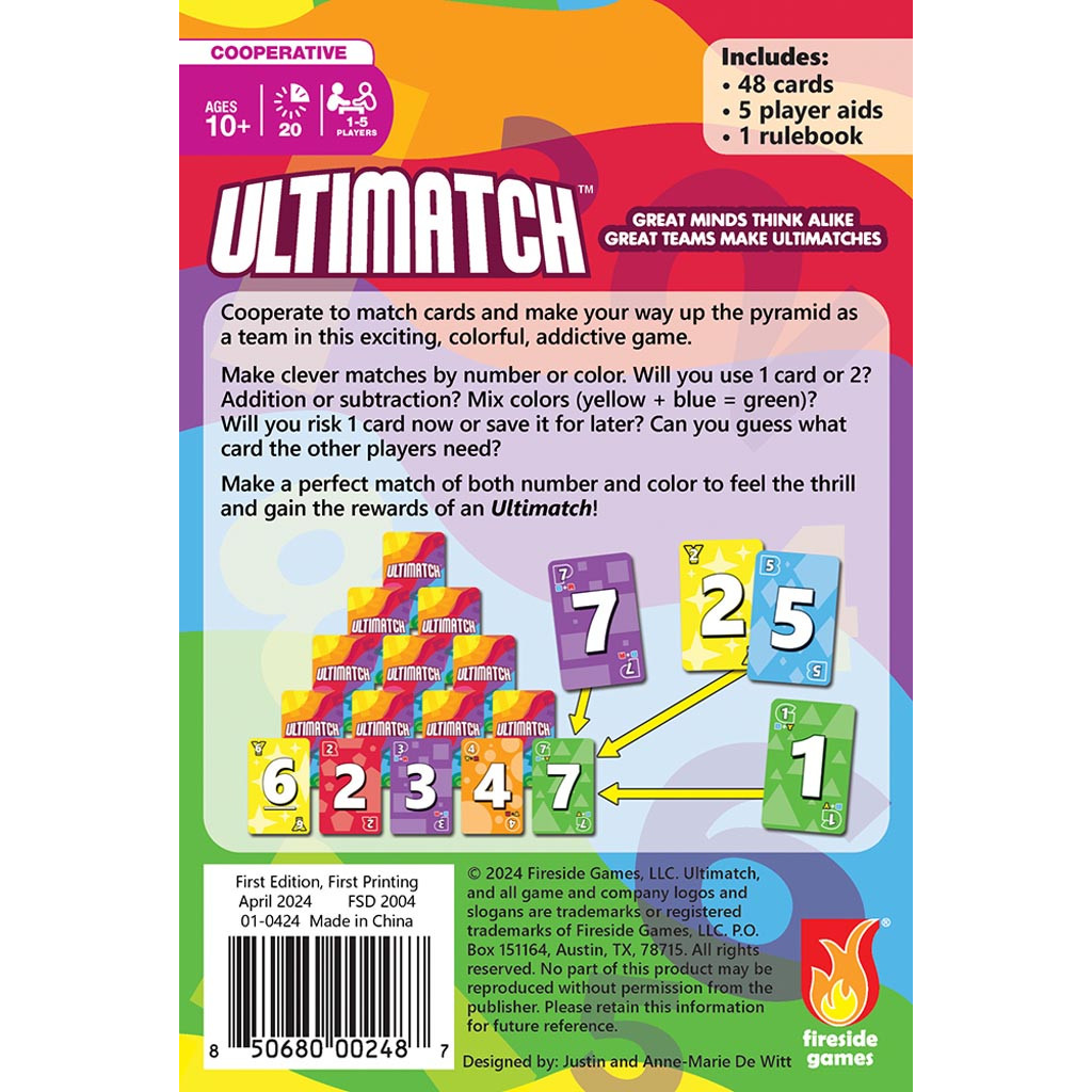 In Ultimatches, players work as a team to build and clear a pyramid of cards through clever matching by number, color, or even combining cards using addition or subtraction. Will you save a card for later, risk it all now, or guess what your teammates need to make that perfect Ultimatch? The thrill of cooperation and strategy sets this game apart, making it an addictive choice for gamers of all ages. Whether you're strategizing with a group or playing solo, Ultimatches delivers excitement, creativity, and collaboration in every round.