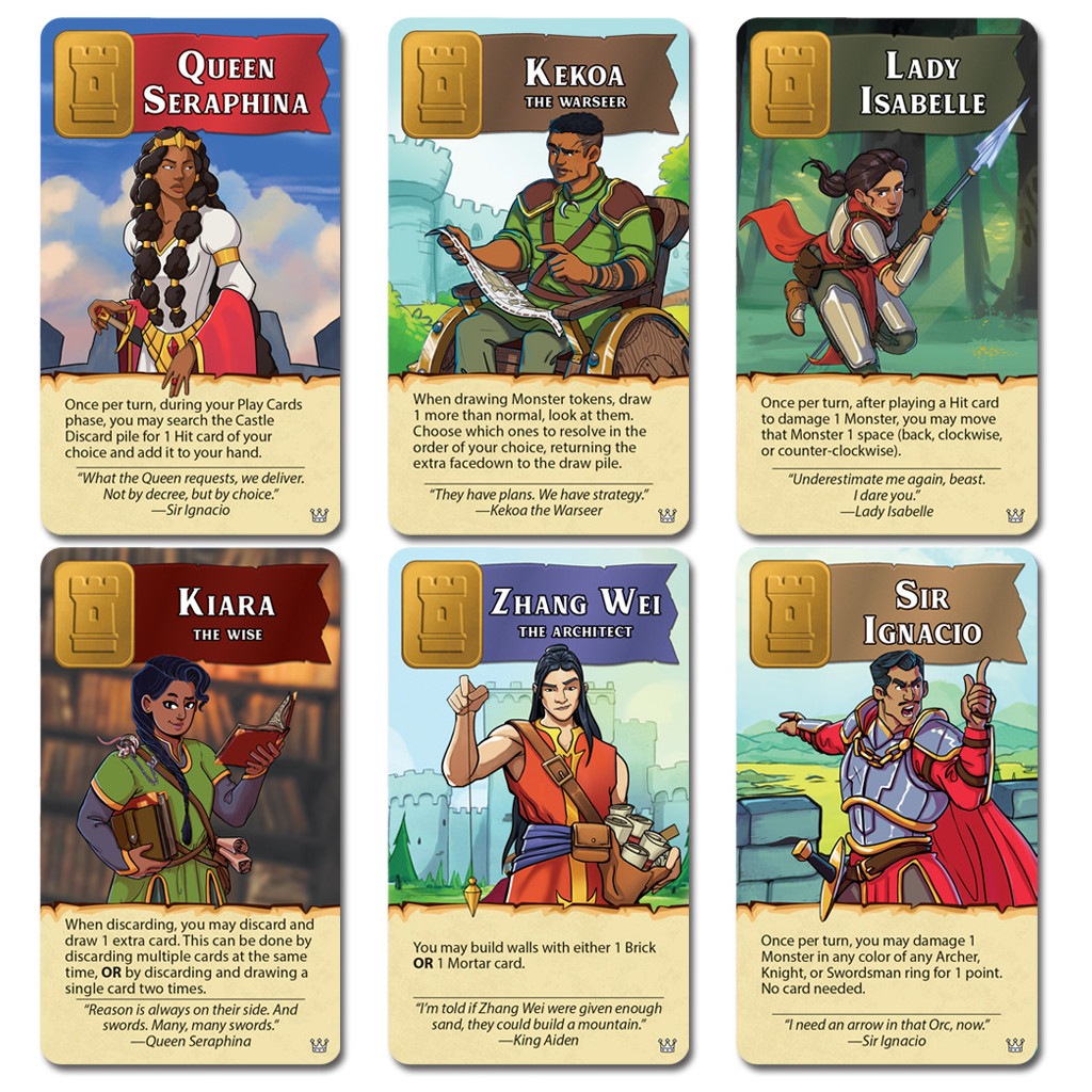 - UNIQUE CHARACTERS AND SPECIAL ABILITIES: Take your gameplay to the next level with 12 character cards, each offering a unique ability to help your team overcome daunting quests and defend the castle.
