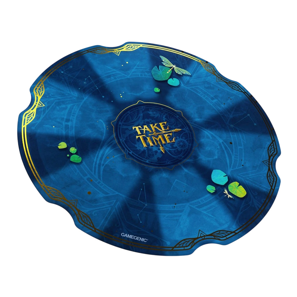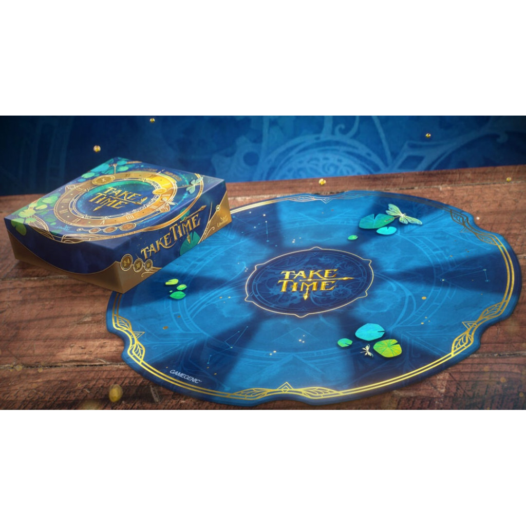 This plush game mat features designated areas for placing cards. It boasts a stunning, vibrant print, and to enhance its premium design, it is adorned with gold leaf accents and the Take Time logo.
