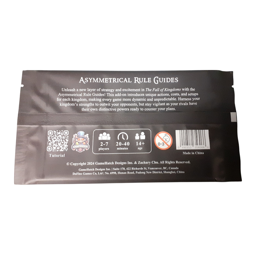 Unleash a new layer of strategy and excitement in the fall of kingdoms with the asymmetrical rules guide ! This add-on introduces unique actions, costs, and setups for each kingdom, making every game more dynamic and unpredictable. Harness your kingdom's strengths to outwit your opponents, but stay vigilant as your rivals have their own ditinctive powers ready to counter your plans.