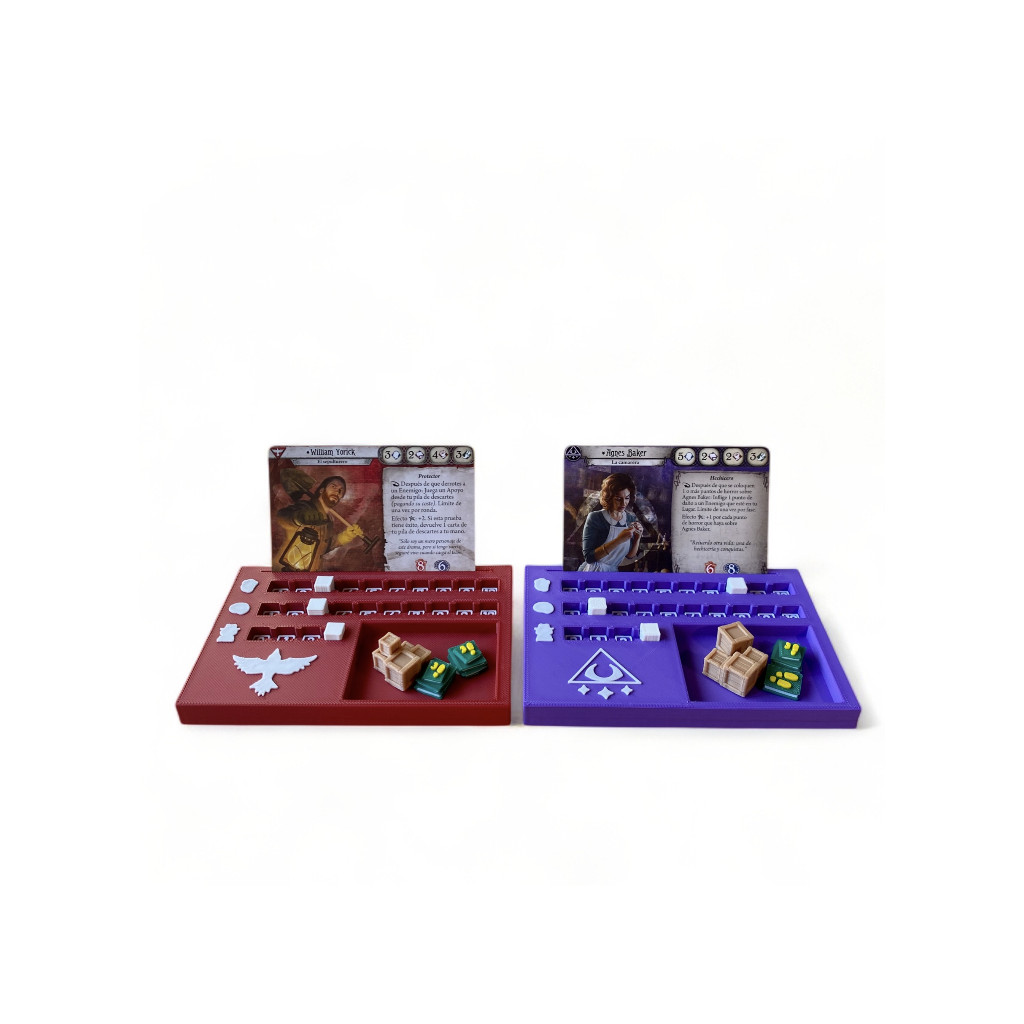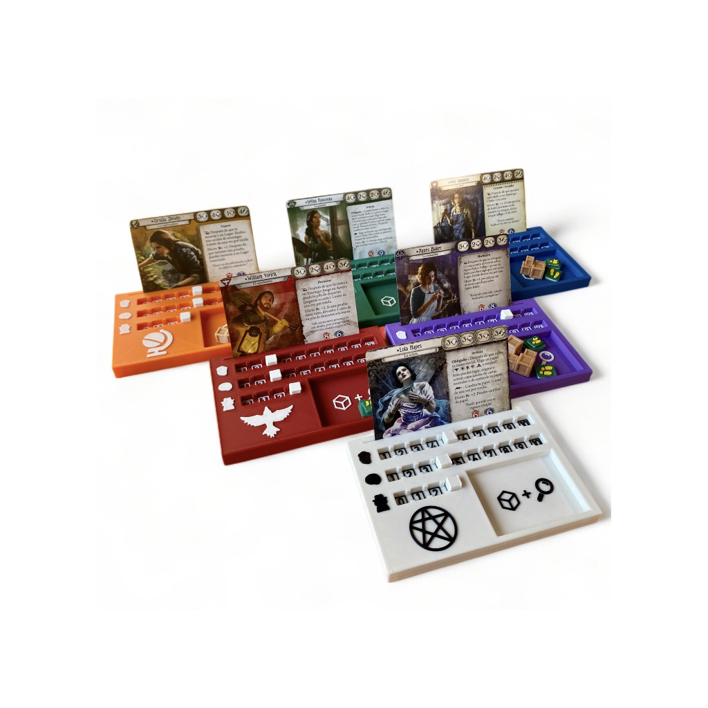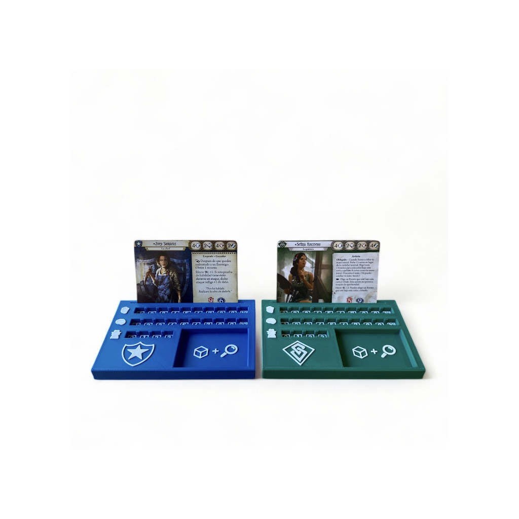First-level fans of Arkham Horror LCG, we’ve created class-specific investigator boards to boost immersion and comfort. Each board holds your investigator card tilted (compatible with all sleeves), tracks remaining health, sanity and actions with white cube markers, and includes a storage area for resources and clues for a clear, practical gameplay experience.