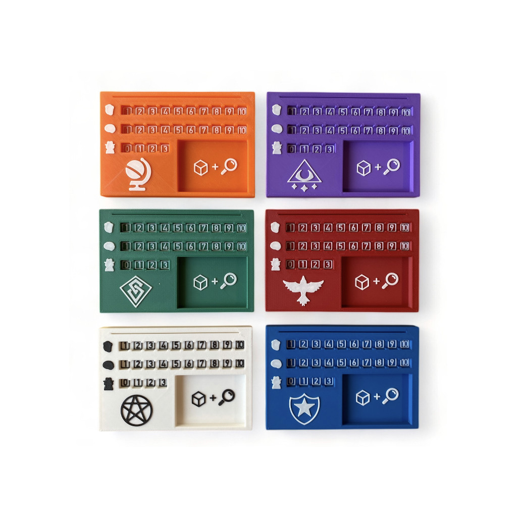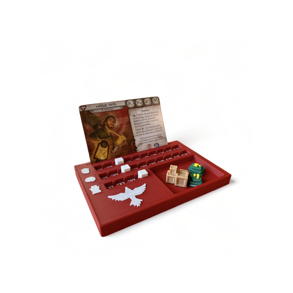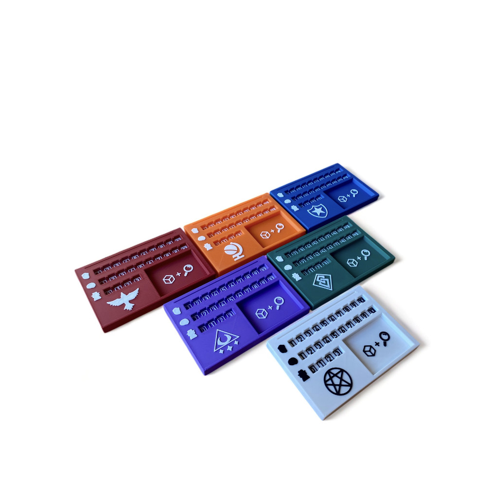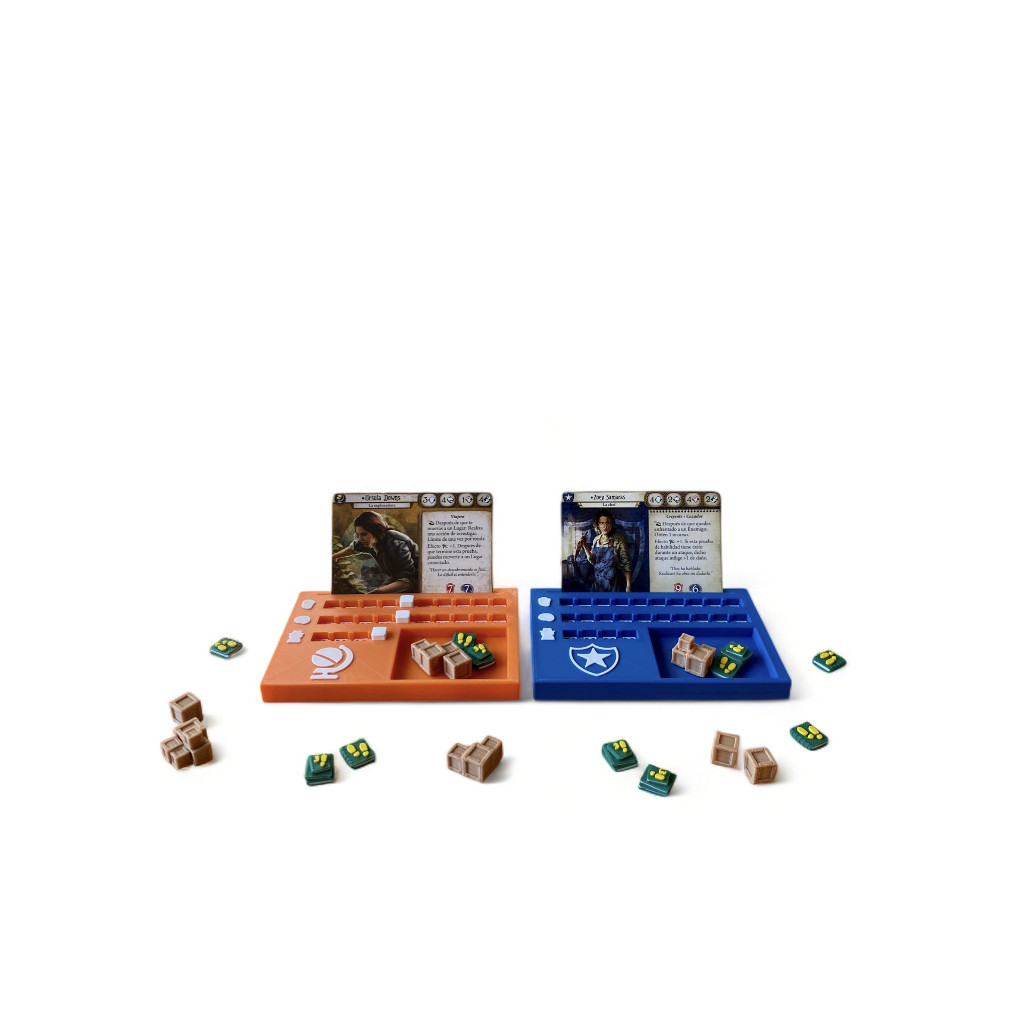 First-level fans of Arkham Horror LCG, we’ve created class-specific investigator boards to boost immersion and comfort. Each board holds your investigator card tilted (compatible with all sleeves), tracks remaining health, sanity and actions with white cube markers, and includes a storage area for resources and clues for a clear, practical gameplay experience.
