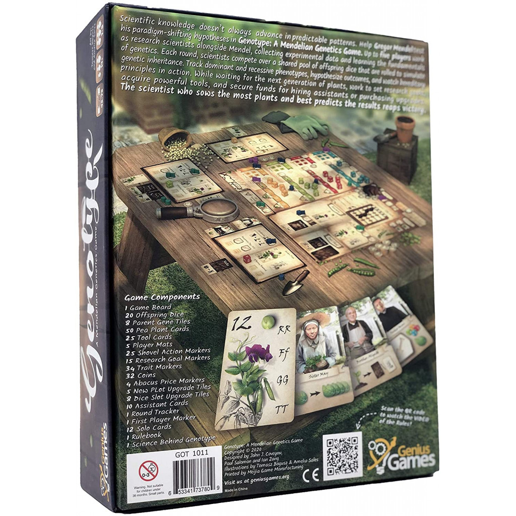 Genotype: A Mendelian Genetics Game is a strategic board game set in St. Thomas' Abbey, where Gregor Mendel performed his paradigm-shifting experiments. Genotype is a worker placement and dice-drafting game where 1-5 players take the roles of research scientists competing to collect and validate experimental data on pea plants.