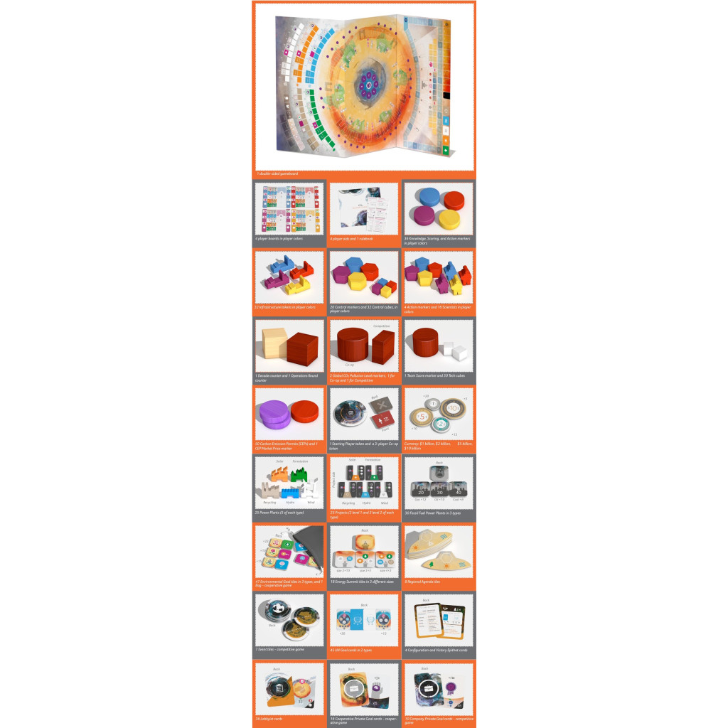 This new and totally re-designed edition of CO2 will bring completely new iconography, an entirely new rulebook (with lots of 3D pictures for easier comprehension of the rules), more balanced gameplay, a new events deck, improved and streamlined mechanisms, a shorter length of play and upgraded wood components for the power plants (instead of cardboard tokens), while maintaining beautiful illustrations on the board and cover.