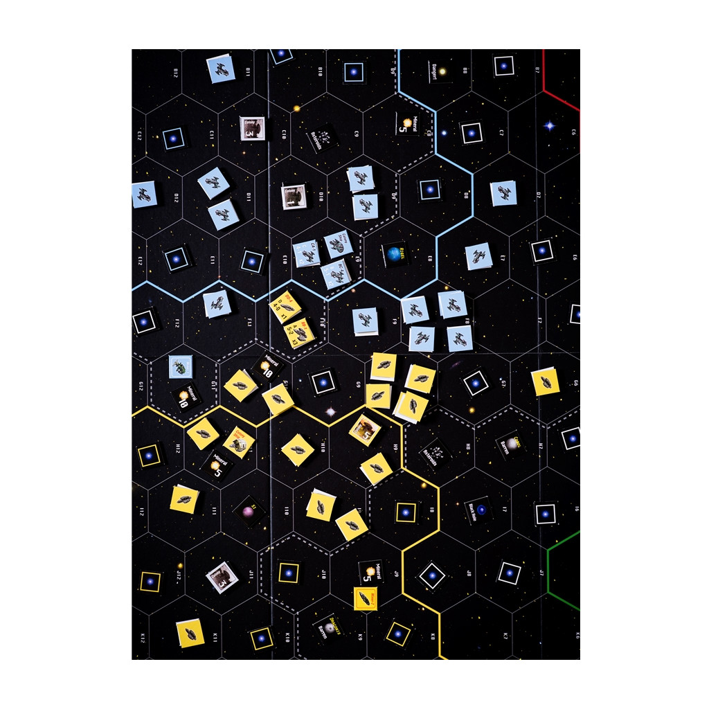 Each space can reveal any of 12 different terrain effects like asteroids, nebulae, and planets. Terrain is important as it impacts both combat and movement, as well as how you will build your empire. Players then eXpand their empire by forming colonies (long term, steady growth), harvesting resources (quick income), and building a merchant fleet (trade income).