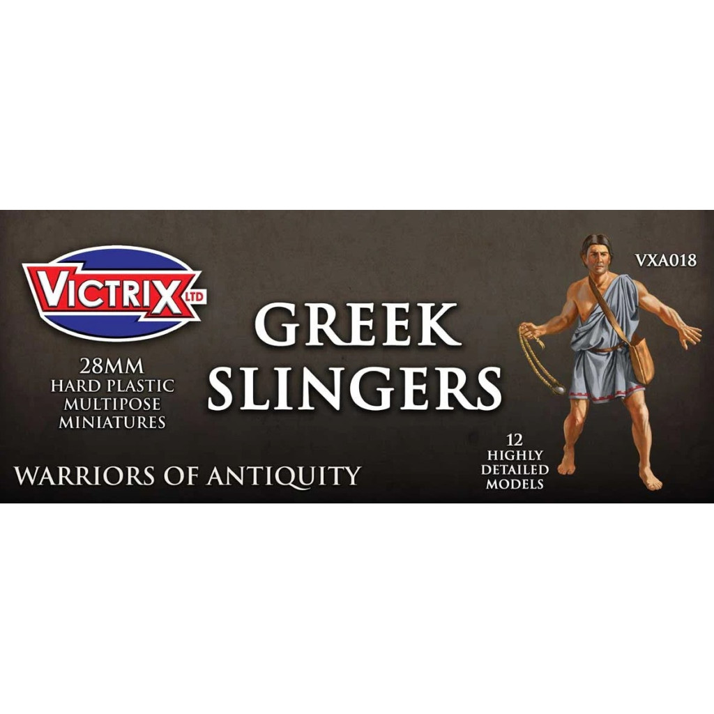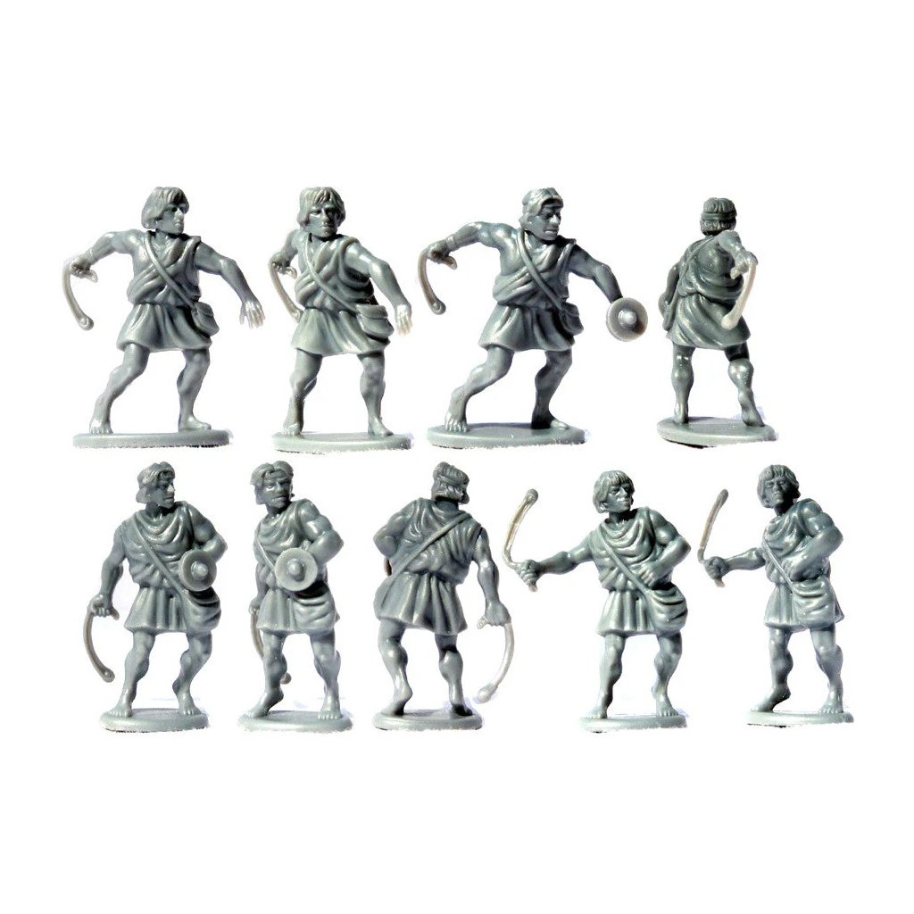 The kit "Greek Slinger Reinforcement Pack" contains 12 plastic greek slinger figures. Figures supplied unassembled and unpainted.