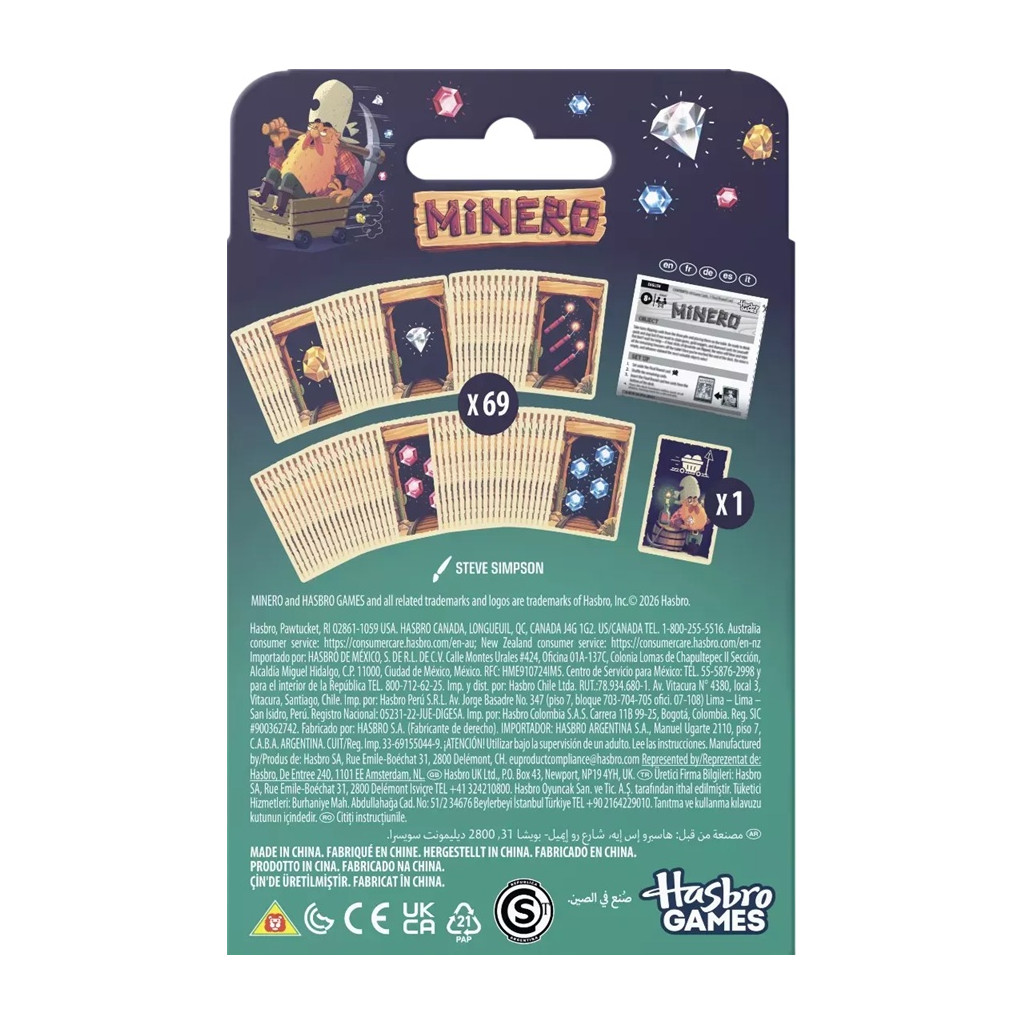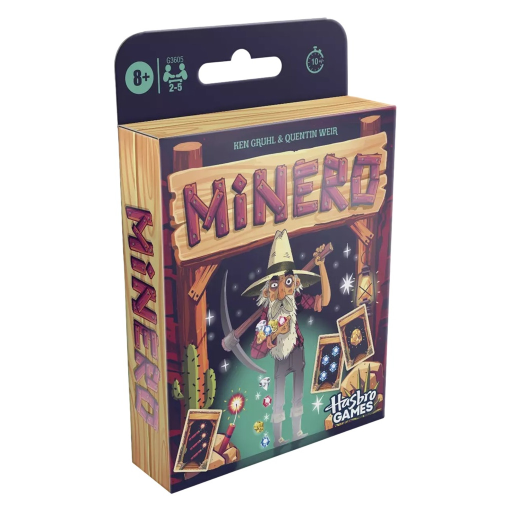 In Minero, cards are revealed one by one in the center of the table, revealing treasures that everyone tries to collect at the right moment. You have to be quick to grab the gems and nuggets before the others, while keeping an eye out for explosive cards.