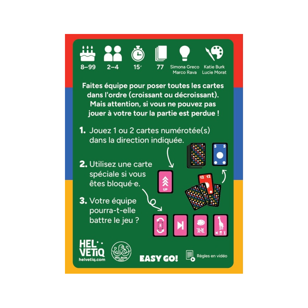 In this cooperative game, you must work together to lay all your cards in order. To do this, you have 60 cards numbered from 1 to 60, in 5 colors, and several Jokers. On your turn, without revealing the numbers or colors of your cards, play 1 or 2 cards onto the shared pile in the correct order, then replenish your hand to 4 cards.