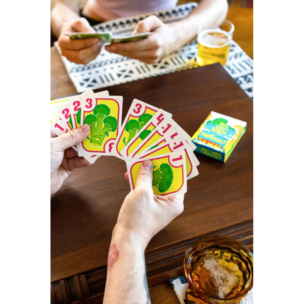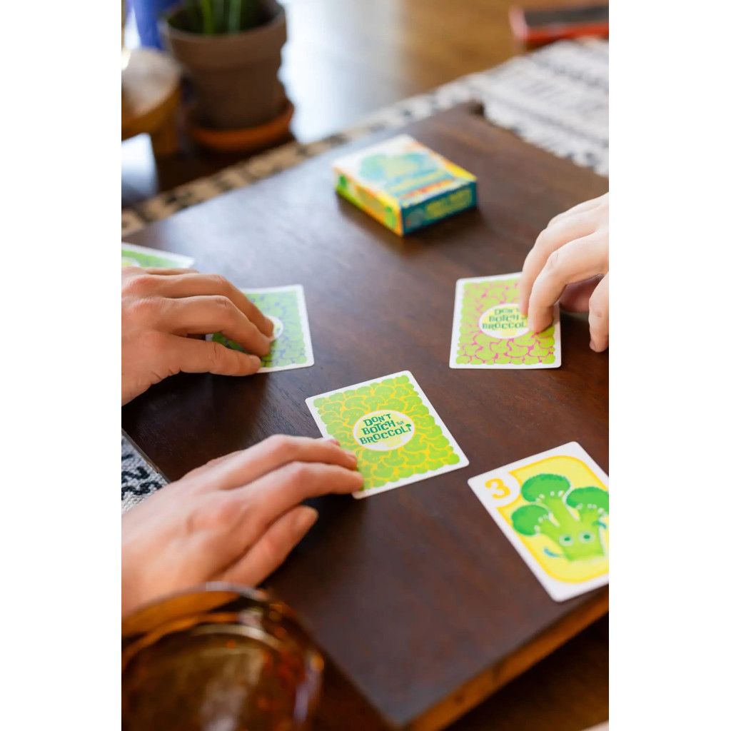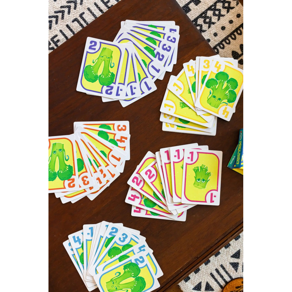 In Don't Botch the Broccoli, players have a hand of broccoli cards and simultaneously play one each turn. Players who play the same number move their card to their steamer, then whoever played the lowest remaining card gets to cook their broccoli, scoring it and any cards in their steamer. All other cards are botched and return to their owner's hand.