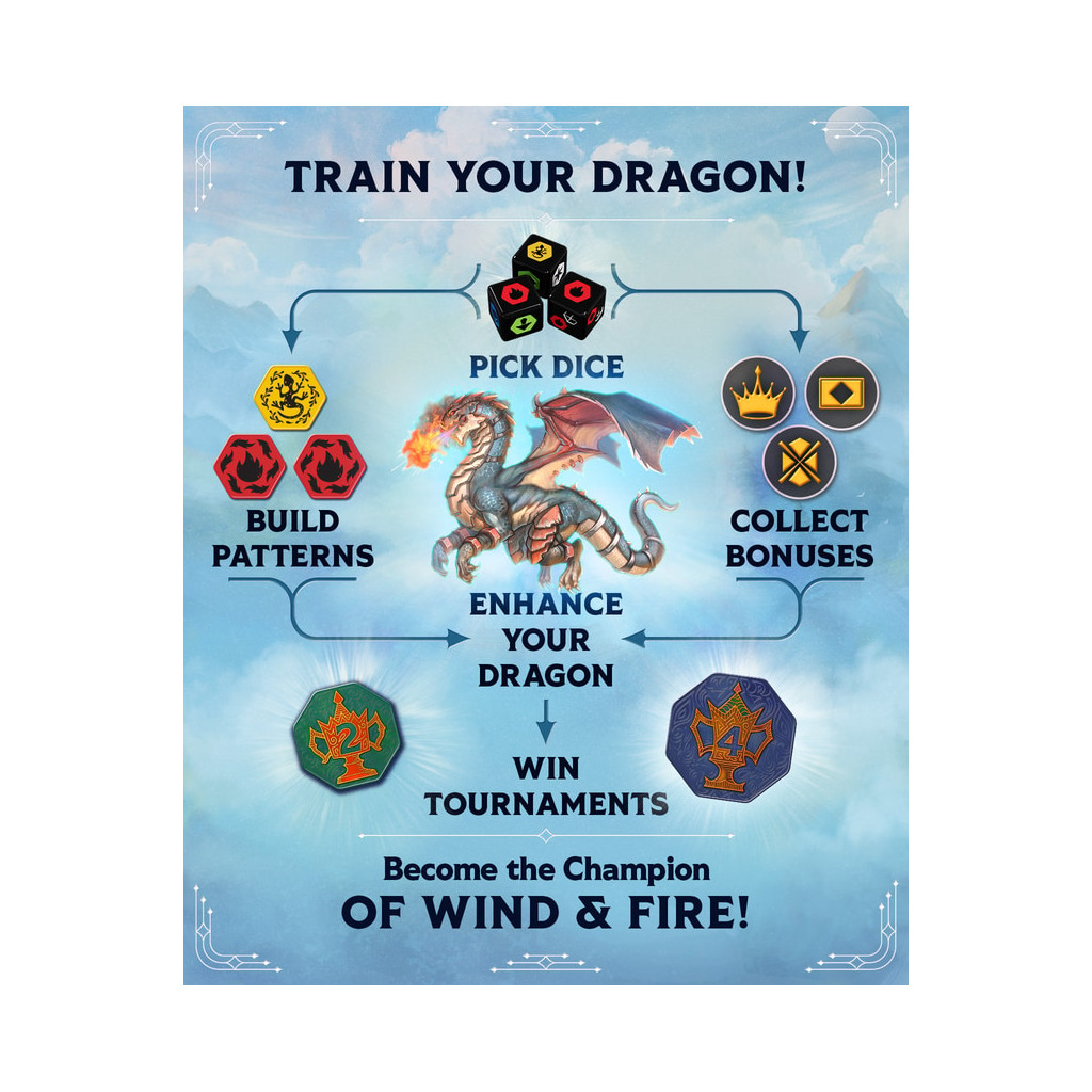 Champions of Wind & Fire is a dice-based dragon-training game for 1-4 players, with a playtime of 45-60 minutes. The game combines dice selection and resource management in the Dragon Training phase, followed by betting in the Tournament phase. Additionally, you can play action cards at any time to surprise your opponents. While having the strongest dragon offers advantages, players must strategically distribute its power across different tournaments (by betting their magical elements) to secure victory.