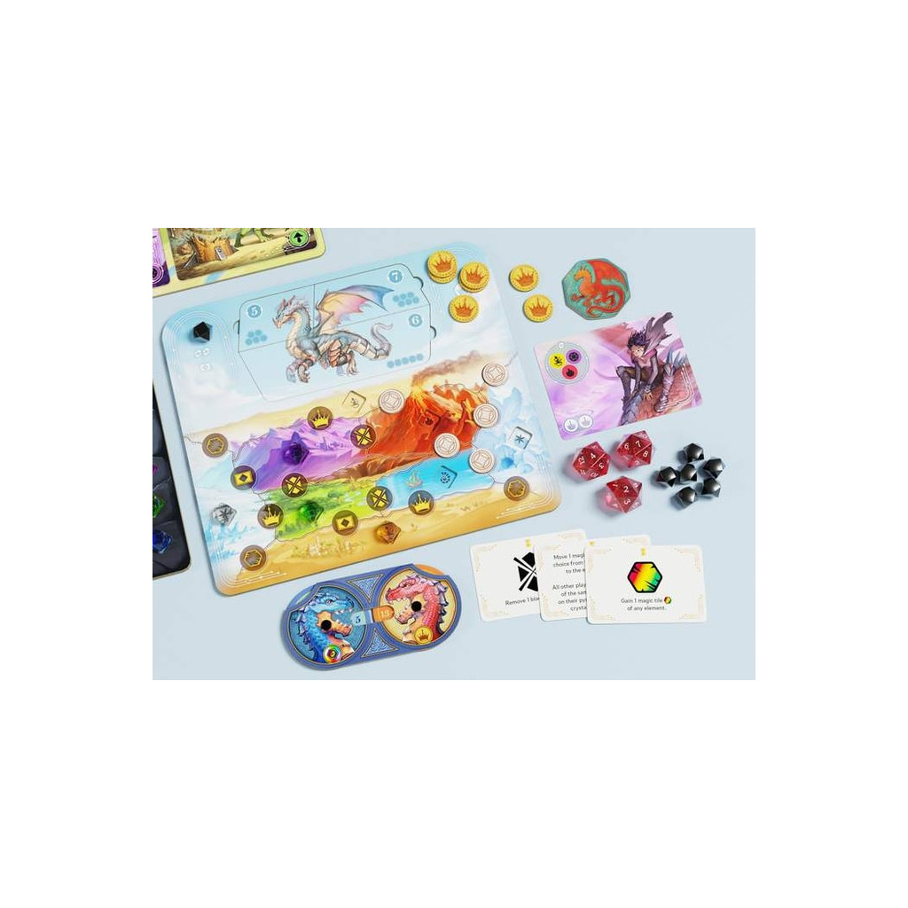 The game consists of two phases: Dragon Training and Tournaments. You will level up your dragon by collecting magical stones on the Pyramid of Elements or sending it to the training grounds. Once the Tournament phase begins, place hidden bets, use the collected magical resources to boost your dragon's power, and play action cards to surprise your opponents!