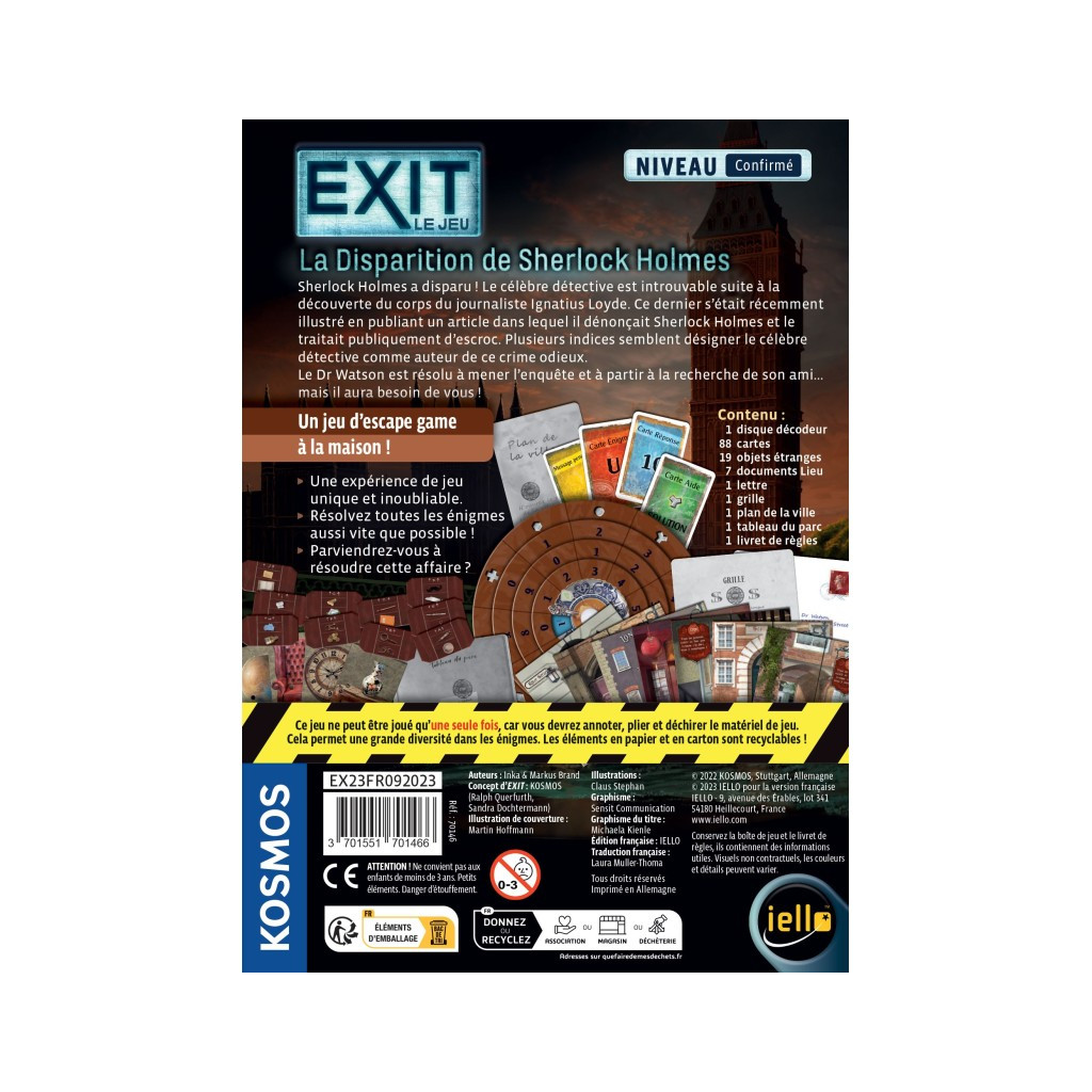 Quel est le comble pour un détective ? C’est de disparaitre ! Et c’est ce qui est arrivé au célèbre Sherlock Holmes ! Il vous faut le retrouver sans délais, Scotland Yard a besoin de lui… et lui de vous ! Exit Sherlock Holmes vous attend !