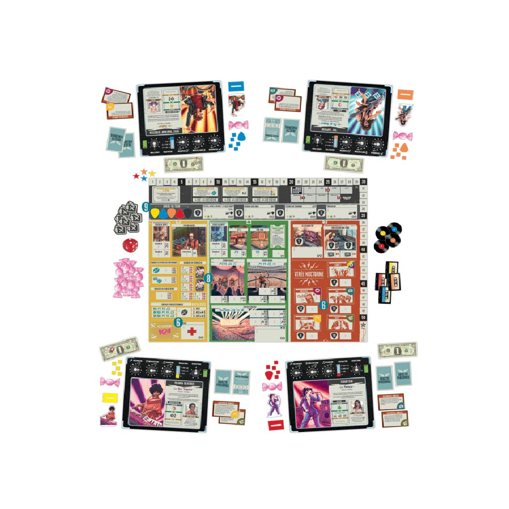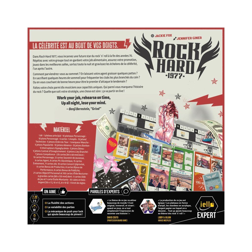 Rock Hard: 1977 is played over a maximum of nine rounds, each representing a typical day of one month in 1977, from April to December. You win the game by accruing the most fame. How? Increasing reputation, chops and songs; achieving production, performance, and publicity bonuses; getting record deals and earning royalties; playing concerts; and hanging out at the hottest after-hours spot. Ready to live like a rock star?