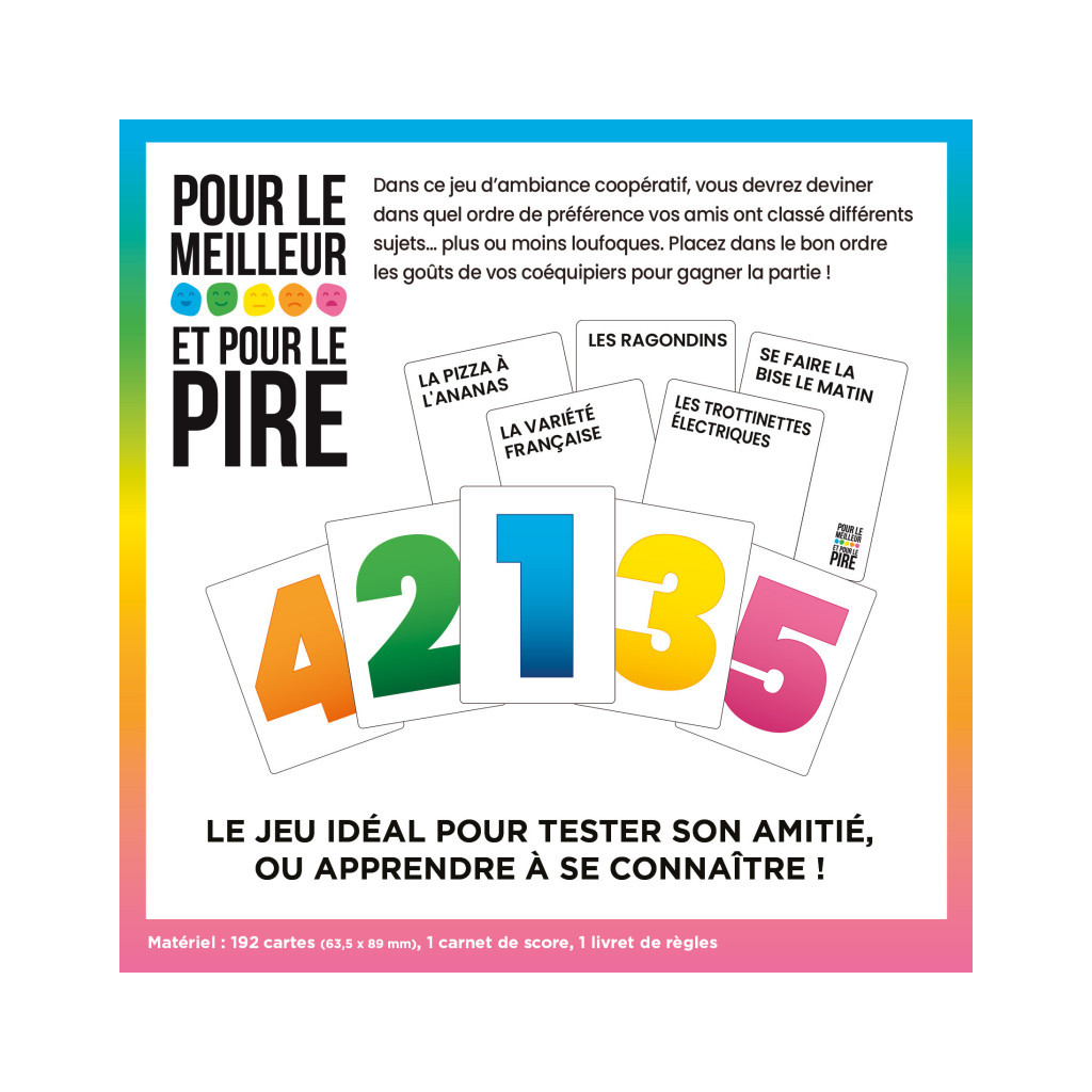 In Pour le Meilleur et pour le Pire, you have to guess the order of preference your friends have given to various topics... some of which are a little crazy. Put your teammates' preferences in the right order to win the game.