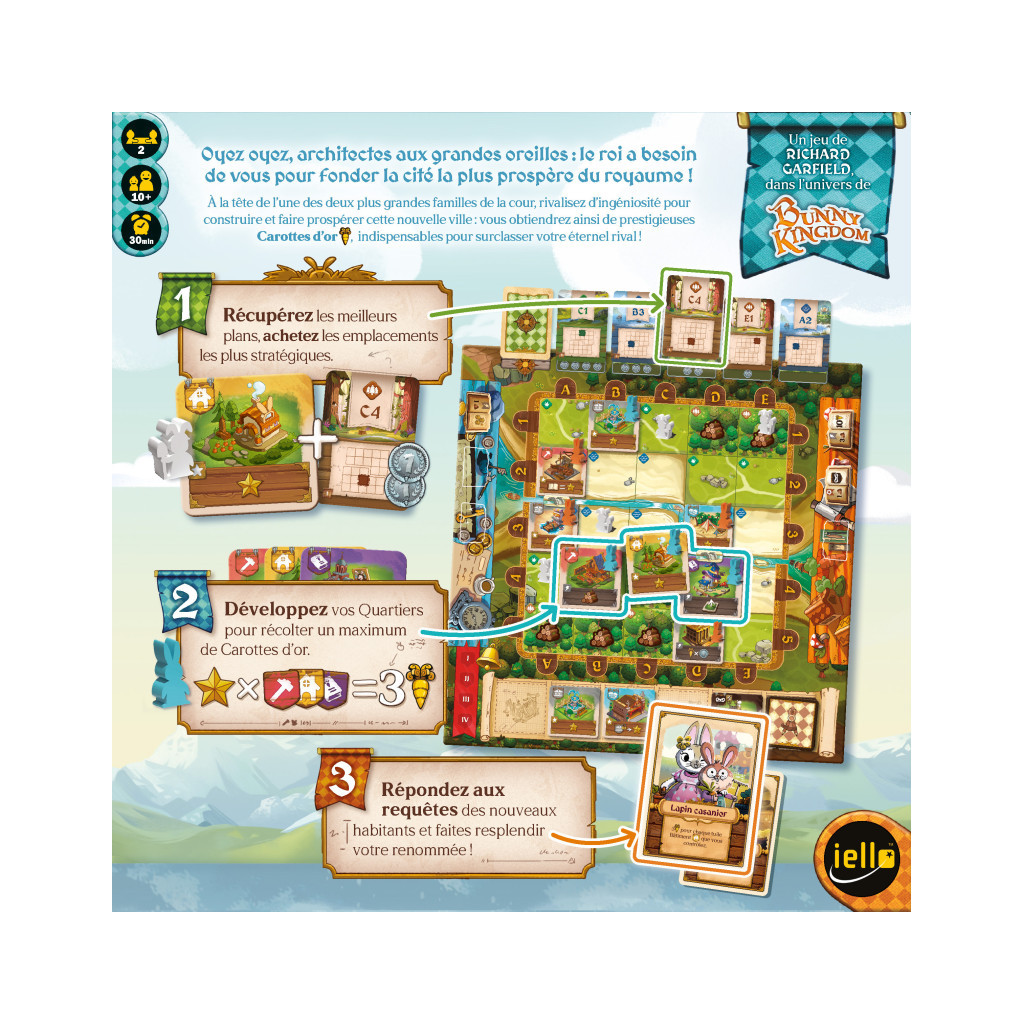 In Bunny Kingdom Town, you purchase the buildings that best suit your strategy and place them in the best locations to develop your neighborhoods and earn more golden carrots... unless, of course, you choose the exact location your opponent had spotted in order to thwart their expansion plans.
