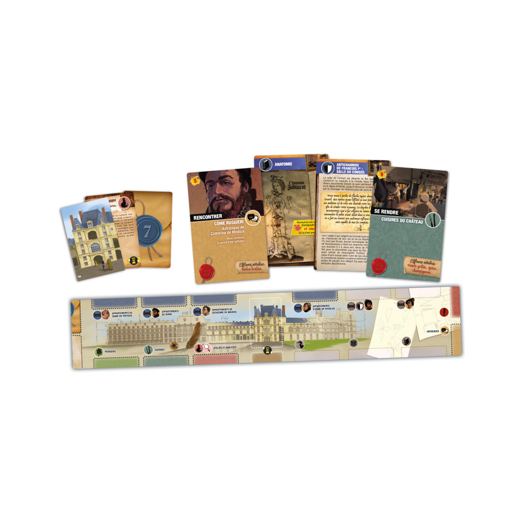 Time will continue to tick away, perhaps with surprises in store as you delve into the French royal intrigues of the 16th century, inspired by historical events. Conduct your investigation, card by card, but time is running out and your choices have consequences...