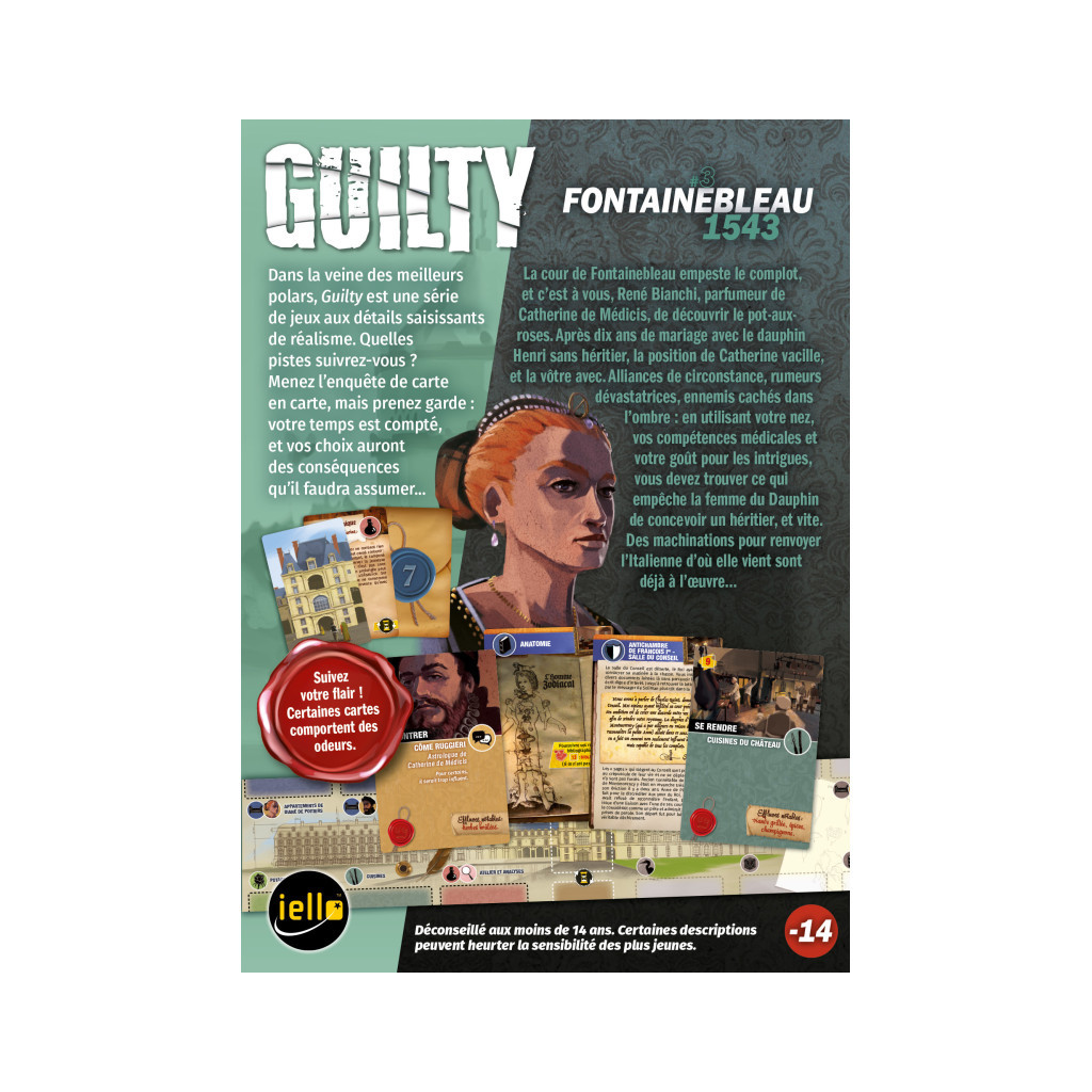 To start Guilty: Fontainebleau 1543, read the introduction, then place the cards shown on the table. Choose a card, turn it over, and read it. What will you find? After reading, you may have to put your nose to the test with scratch-and-sniff cards that bring history to life.