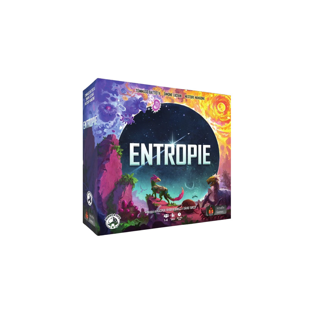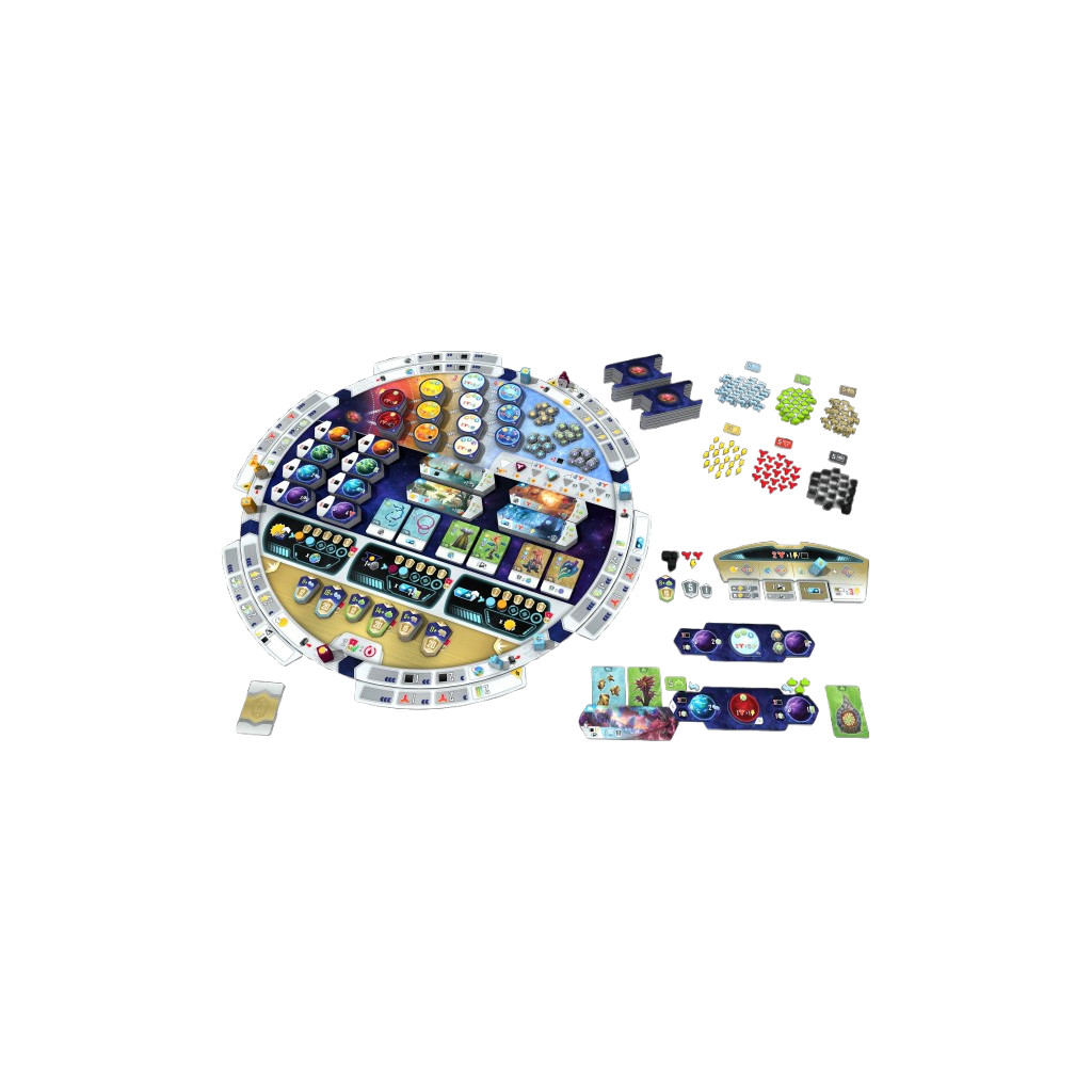 Entropy is played over a variable number of turns. Each turn, you must move your scientist 1 to 3 spaces clockwise around the main board. You must end your move on an inner Action space on the main board or on an outer space of an Action tile, and resolve it.