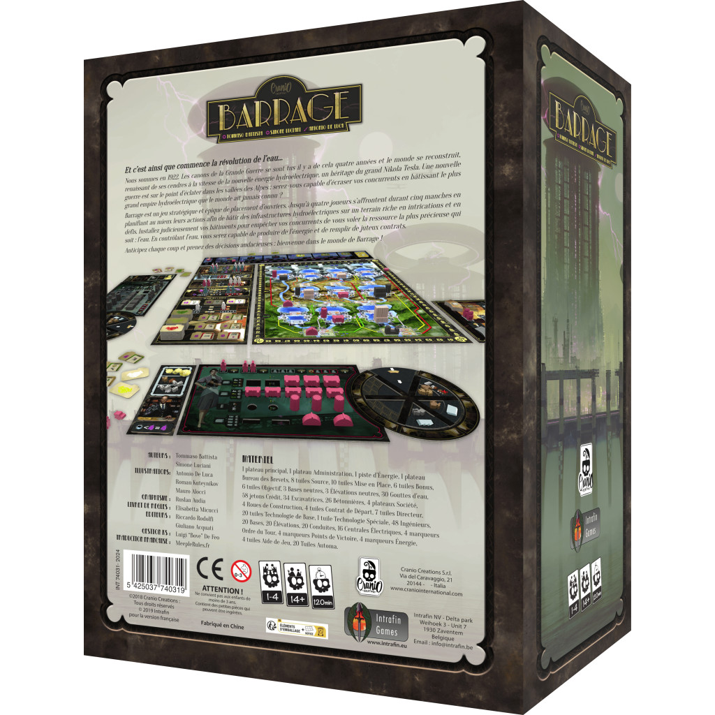 Each player represents one of the four international companies who are gathering machinery, innovative patents and brilliant engineers to claim the best locations to collect and exploit the water of a contested Alpine region crossed by rivers.